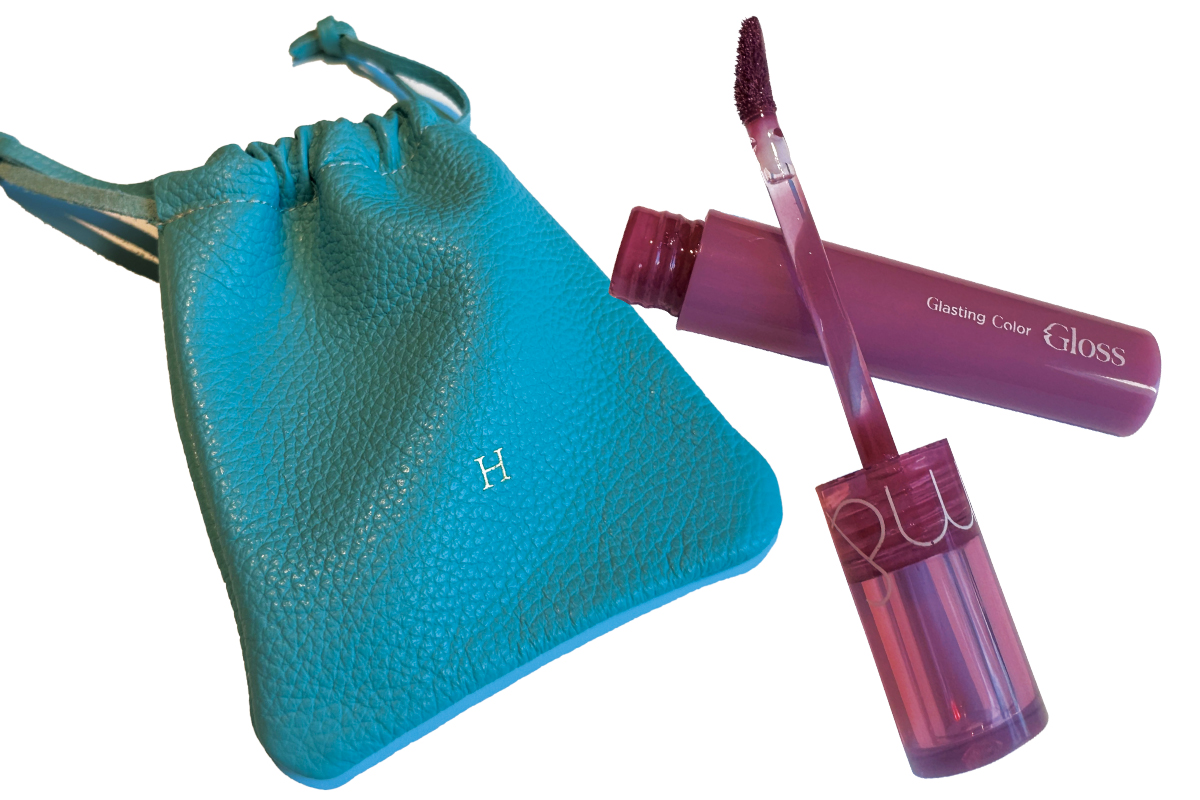「イニシャルポーチは職人さんの手作り。リップは鮮やかな発色とガラスのようなツヤ感がお気に入り」(ともに私物)