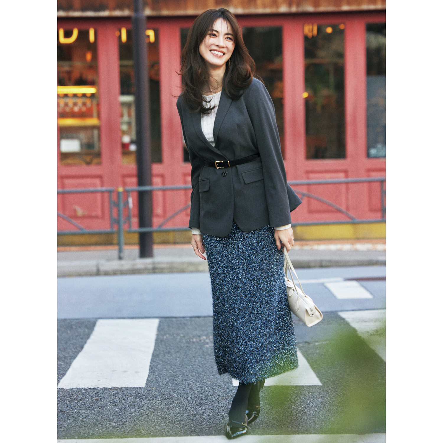 今季のトレンドでハズせない“ ラメもの”。しかもウェーブタイプは大得意! Ⅰラインスカートで取り入れると下半身がほっそり見え。