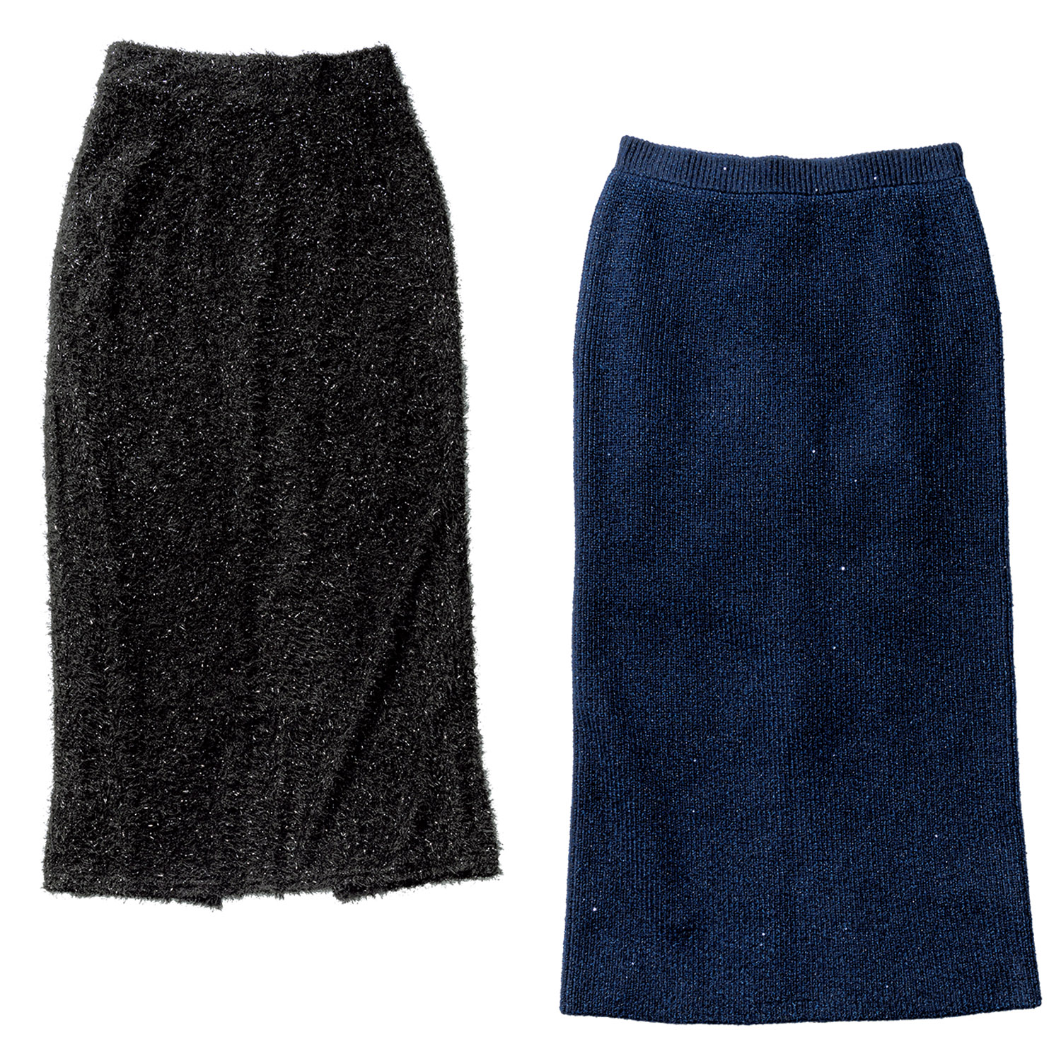 左・黒ラメシャギースカート¥1,799(GRL)右・ネイビーラメニットスカート[ニットトップスセット]¥25,300(ジャスグリッティー/ジャスグリッティー プレスルーム)