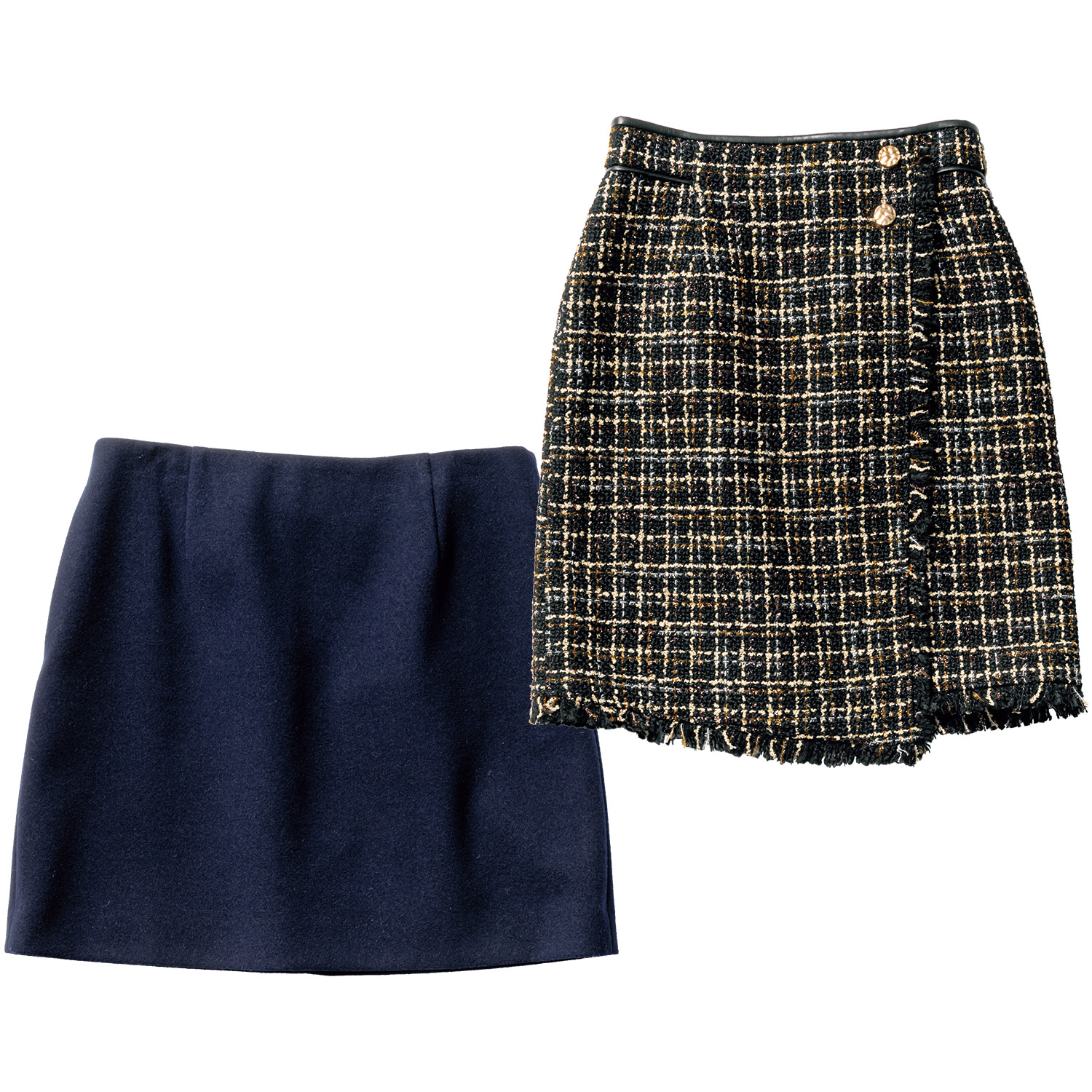 左・ネイビースカート¥12,100(ノーク)右・ツイードラップスカート¥19,800(ジャスグリッティー/ジャスグリッティー プレスルーム)