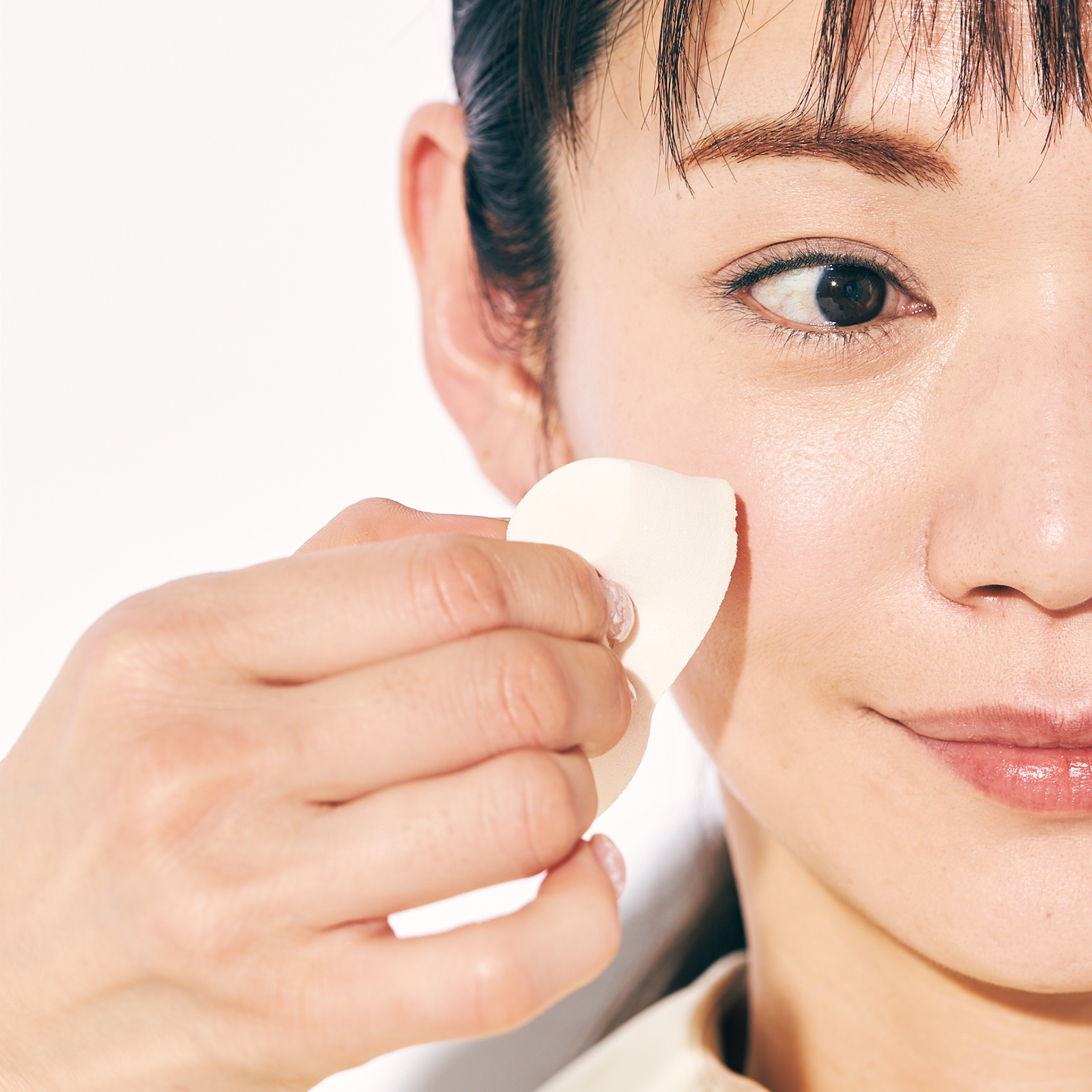 3.スポンジをつまみ、先端でトントンと軽くタップして。ピンポイントにもなじませやすく◎。