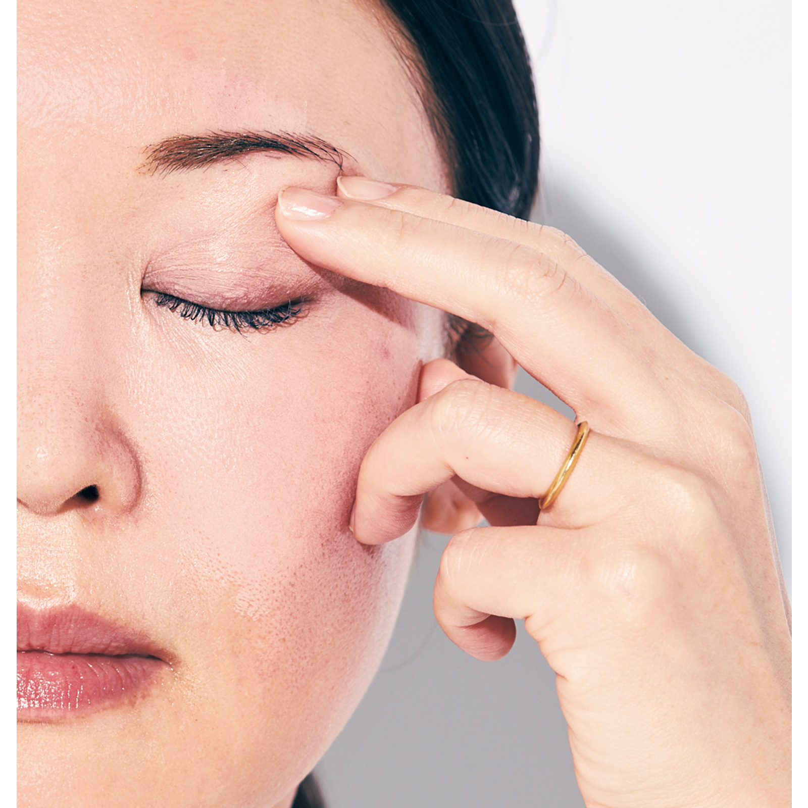 2.残りをまぶたにも軽くトントンと馴染ませると、目元のくすみも晴れ、アイシャドウベースにもなり一石二鳥。