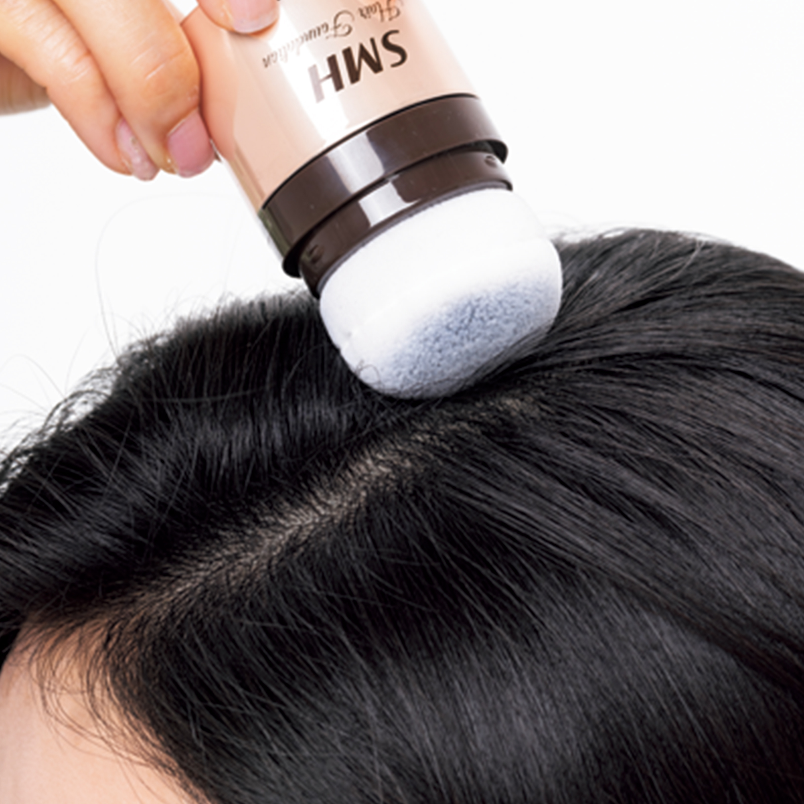 白髪のある分け目をパフ部分でポンポンと軽くたたくように塗布。白髪が見えなくなったら分け目全体に塗布すると自然な仕上がりに。