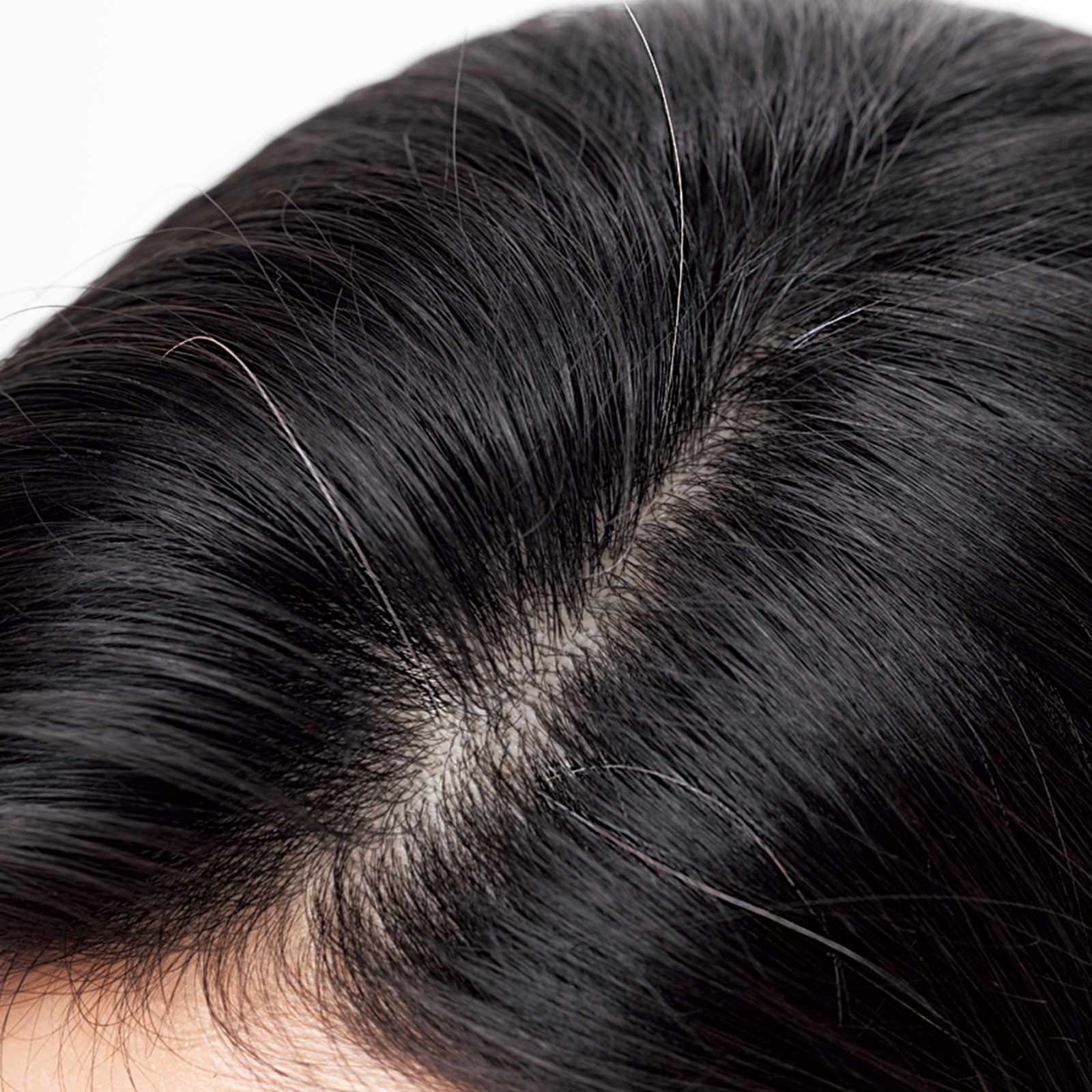 白髪もしっかりと見えなくなり、さらに分け目の地肌の薄見えもケア。まるで毛量も増えたかのような完成度に。