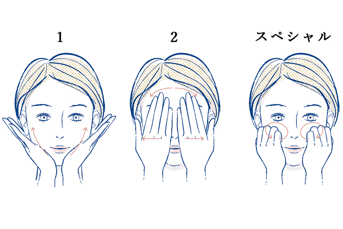 1.顎から耳へ手のひらをゆっくり動かして血流やリンパを促進。2.頰の中央から外側へも同様に。さらに握り拳を頰に置き、円を描くように上へ動かす引き締めスペシャルケアも取り入れて。
