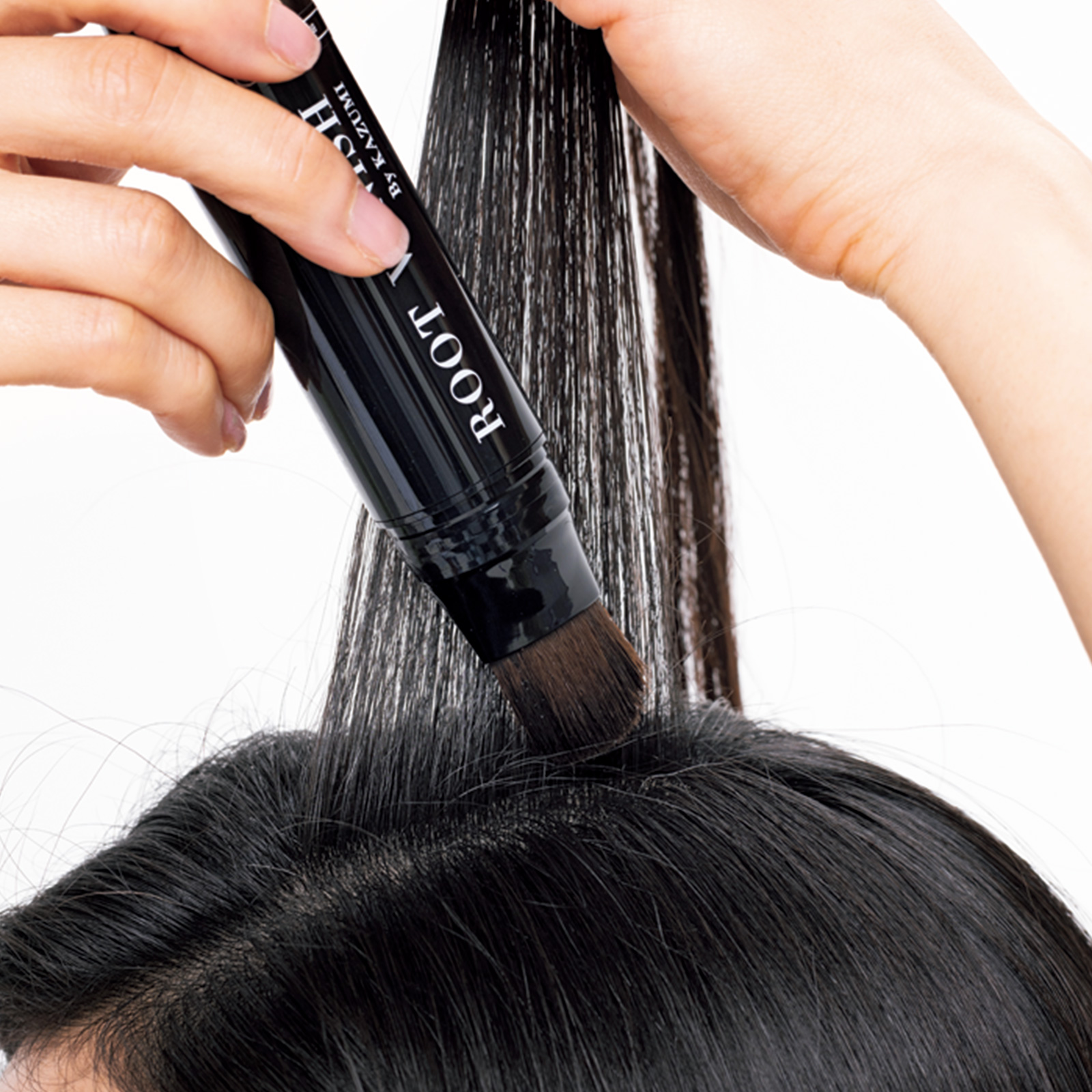 ケアしたつもりなのに、髪をかきあげると白いところが出てくるのは片面しか塗られていないのが原因。両面をしっかり塗るのが大切です。塗布するときはナチュラルに仕上がるように生え際は少量ずつブロッキング。頭皮に押しあてて塗るとボリュームがなくなりムラになるため、毛を頭皮に対して垂直に持ち上げてから根元の両面に塗布。白髪は伸び具合でアイテムを変えるのもポイント