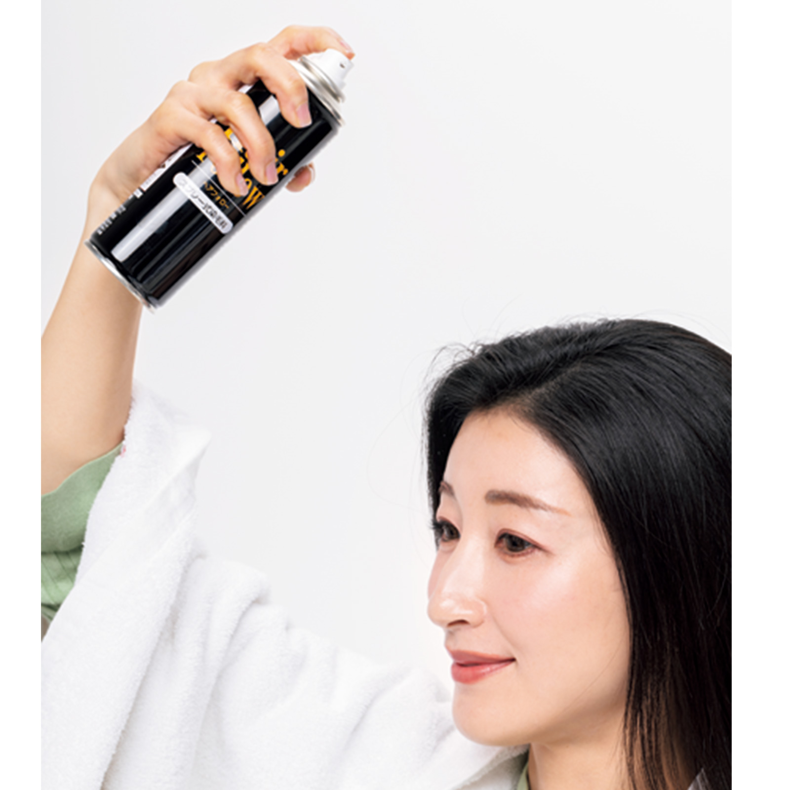 「ヘアマニキュアやヘアファンデーションを塗布したら、ヘアスプレーを仕込みます。根元をふんわりさせて、持続性をアップさせます」ヘアフォロー ブラック¥2,530(アイメディア)
