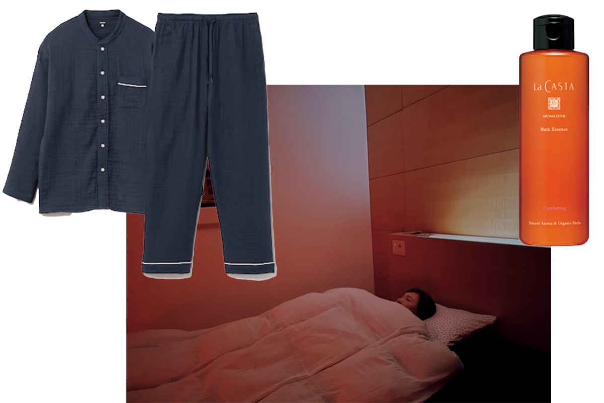 左、ライターの間でも着心地が良いと話題のパジャマに替えてみました。BAKUNE Pajamas Gauze長袖バンドカラーシャツ ユニセックス¥15,400ロングパンツ¥15,400 [一般医療機器](ともにTENTIAL)右、ラベンダーやカモミールでリラックス。アロマエステ バスエッセンス CF 〈コンフォーティング〉200ml ¥2,090(ラ・カスタ)