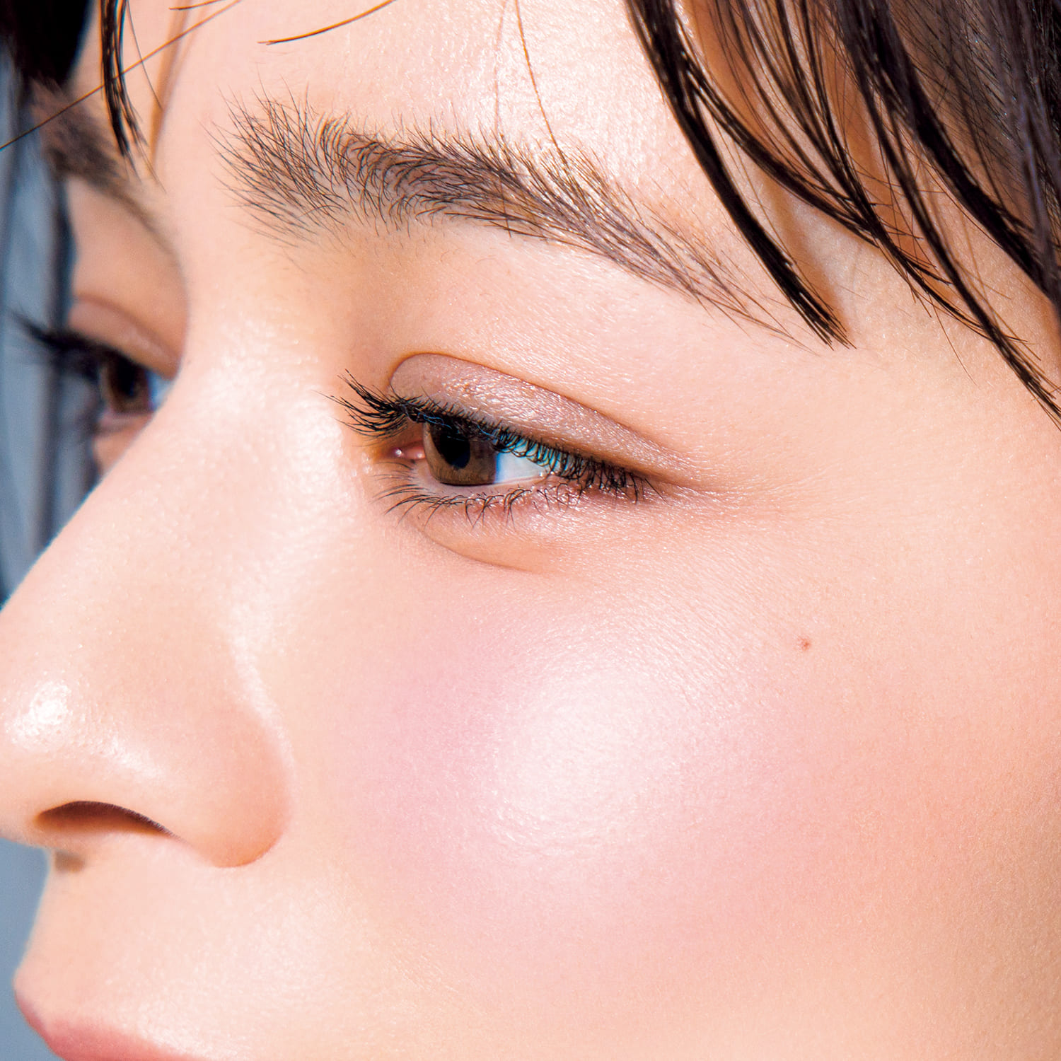 青みピンクのチークを主役にする場合、くすみ肌はNG。まずは寒色系の下地で肌に透明感を仕込んで。チークは大きめのブラシで頰の上半分にのせることで、プリッと立体感のある仕上がりに。また、アイカラーはブラウン系、リップはコーラル系で引き算するのがおすすめ。