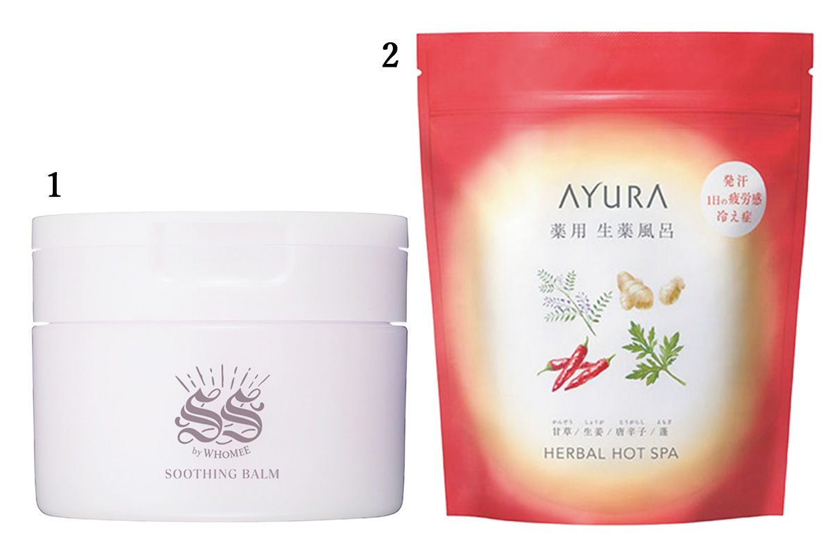 ソソのバームは、もともと肌が弱い私でも刺激を感じずに顔から体までしっかり保湿できます。アユーラの入浴剤はサウナのように深部からしっかり温まり、透明な汗が出て内臓の働きが活発になる感覚。肌の内側から調子が良くなるのを感じます!1.ソソ スージングバーム 50g ¥3,520(SS by WHOMEE)2.薬用ハーバルホットスパ [医薬部外品] 8包¥2,200(アユーラ)