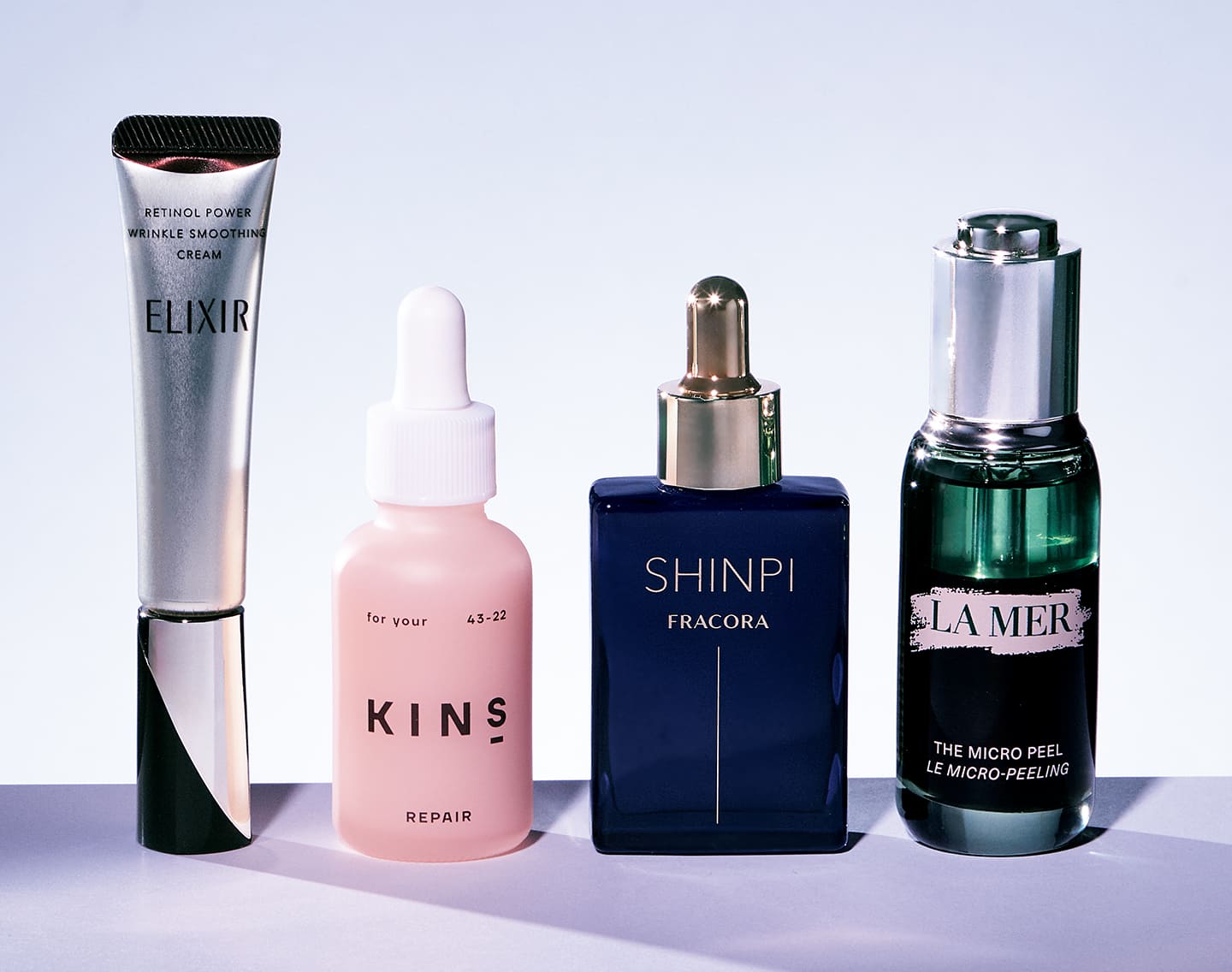 左から:<レチノール>エリクシール レチノパワー リンクルクリーム S[医薬部外品]15g ¥6,490(編集部調べ、エリクシール)<バクチオール>SERUM REPAIR 30ml ¥9,240(KINS)<ヒトカン>シンピ 導入美容液 30ml ¥7,500(FRACORA)<角質ケア>ザ・マイクロ ピール 30ml ¥36,300(ラ・メール)