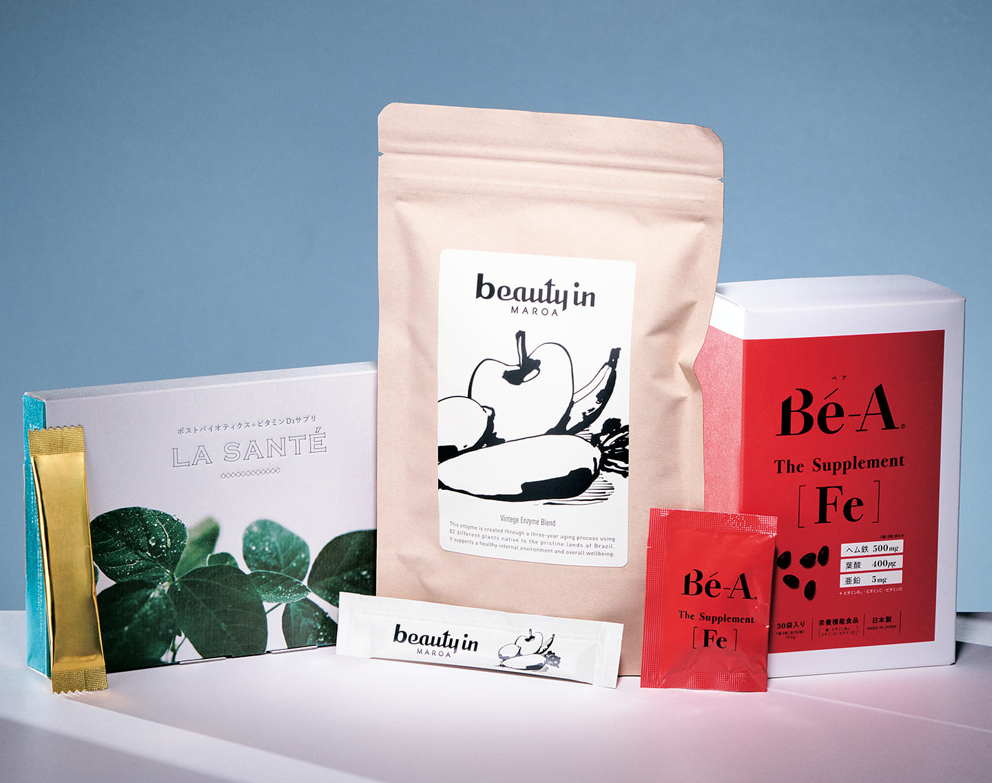 左から:ラサンテ パウダー 30包 ¥9,504(ラサンテ)beauty in MAROA 5.5g×30包 ¥5,616(me)ベア ザ・サプリメント Fe 30袋入り ¥4,750(Be-A)