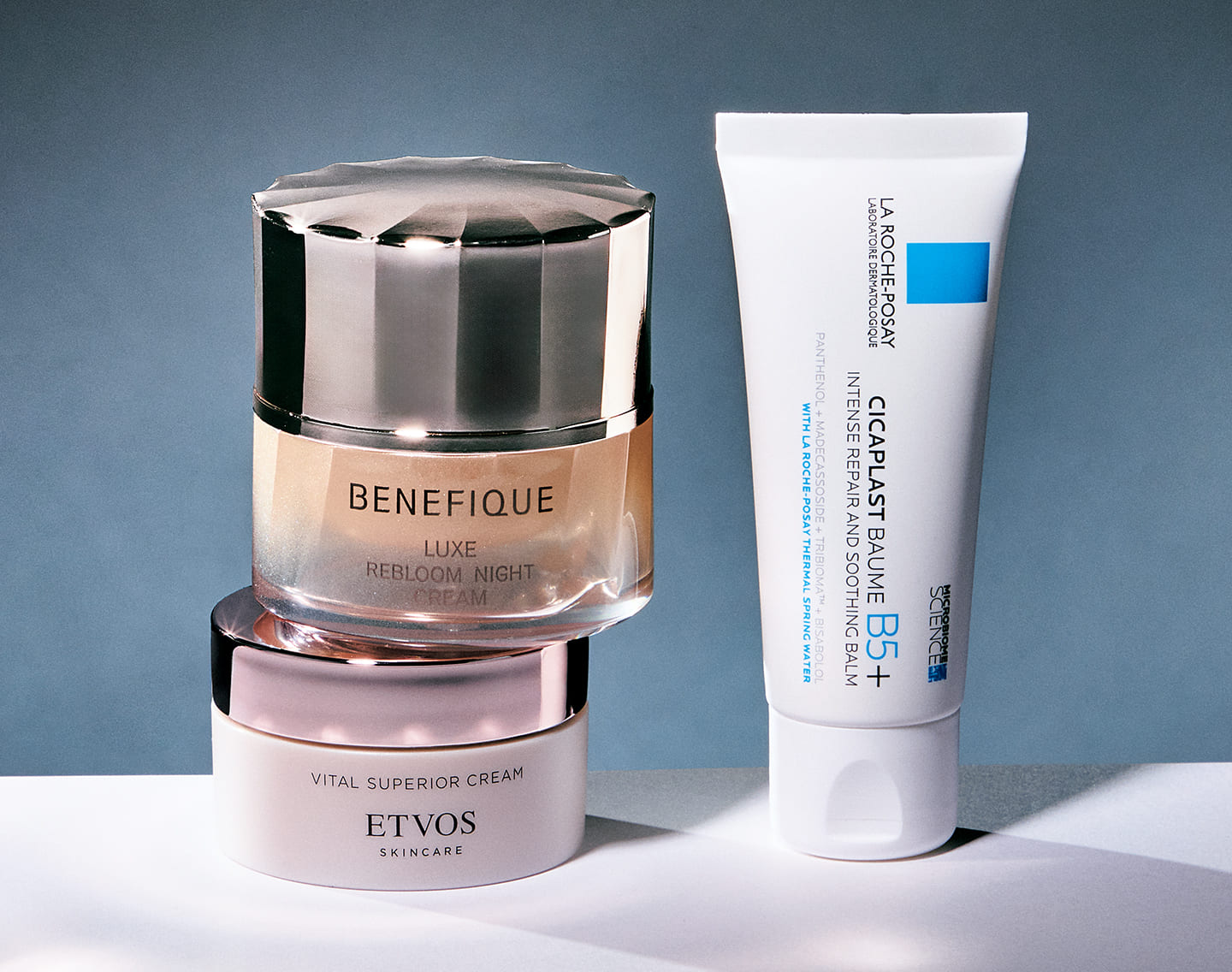左から:ヴァイタルスペリアクリーム30g ¥8,910(エトヴォス)ベネフィーク リュクス リブルームナイトクリーム[医薬部外品]40g ¥24,200(編集部調べ)(資生堂)シカプラスト リペアクリーム B5+ 40ml ¥2,970(編集部調べ)(ラ ロッシュ ポゼ)