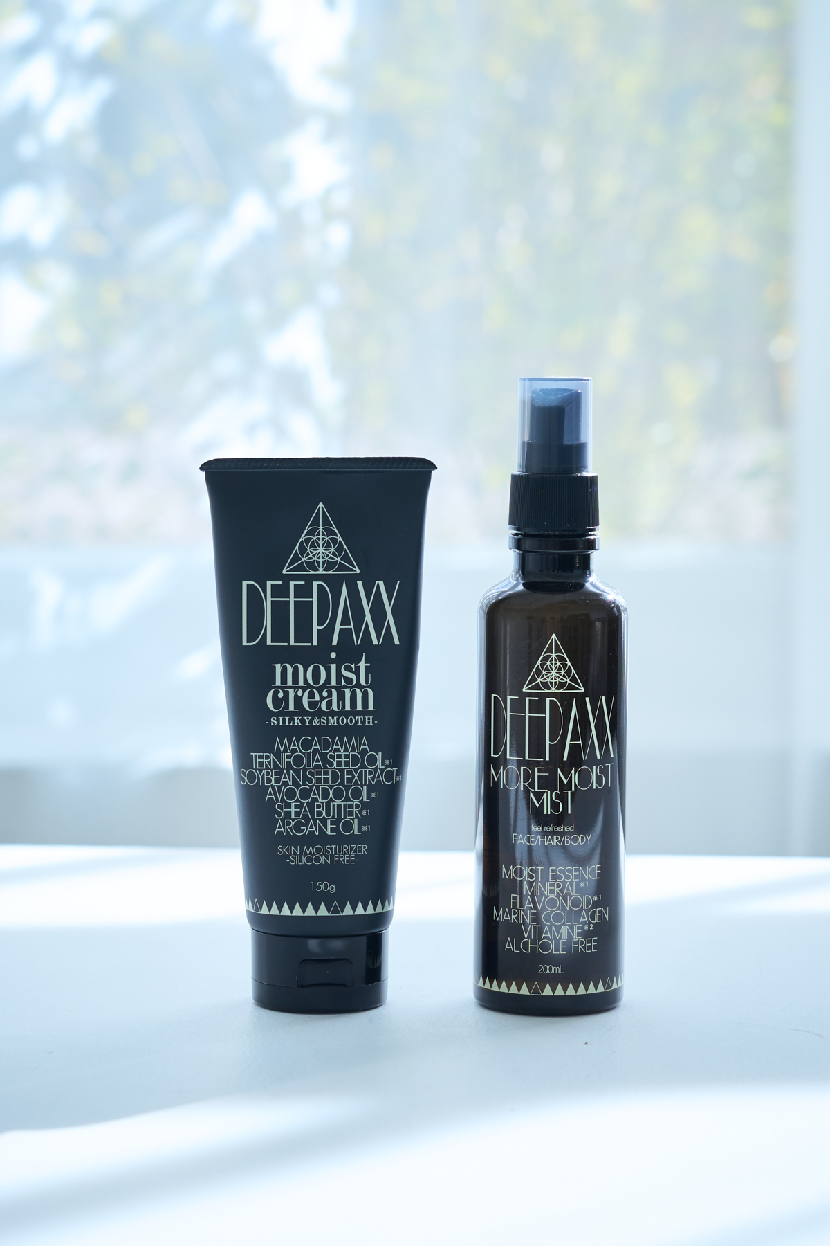 そんな感じで外見を気にしない性分だからコスメになかなか手が出ることがなかったのですが、このDEEPAXXのモイストクリーム(左)とモアモイストミスト(右)は香りも使用感も素晴らしくて完全に五感惚れしました!今は家族で海の近くに住んでいて、夫がサーフィンをするんです。これらは行きつけのサーブボード屋さんで見つけて、そこの女性の店員さんに勧められて購入。その方の肌や笑顔がとっても素敵だったのも決め手のひとつ。夫もすぐに気に入って、今では夫婦のシェアコスメのスタメンです。私は寝癖が毎朝すごいことになっているんですが(笑)、ミストは髪を含め全身に使えるのでスタイリング剤としても重宝。乾燥肌でもしっかり保湿されるので、オススメです!