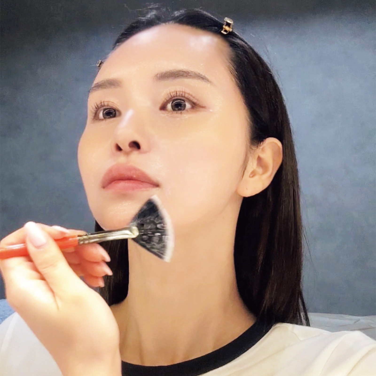 「昔はコンプレックスだった丸顔が、運命チークで好きな部位に変身。頰のいちばん高い部分にツヤ玉を作ると顔全体がパッと明るくなり、実年齢よりも若く見られます」