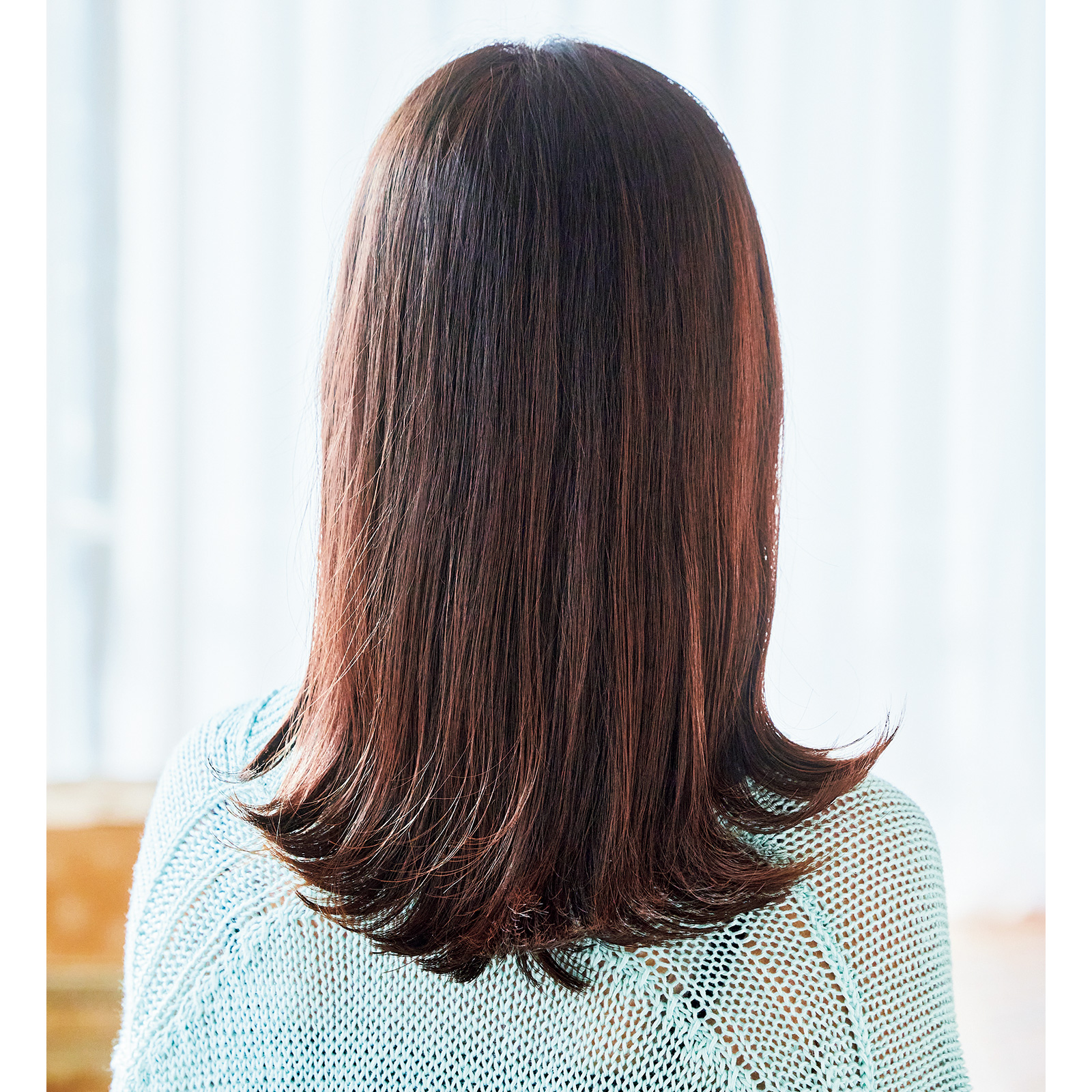 パサついて広がっていた毛先を5cm切って、鎖骨下10cmのロングに。毛先にレイヤーを入れすぎるとスカスカになってしまうので、厚みが残るようにレイヤーは控えめがポイント。スタイリングで毛先を外ハネにすると動きが加わり、より今っぽく変身。