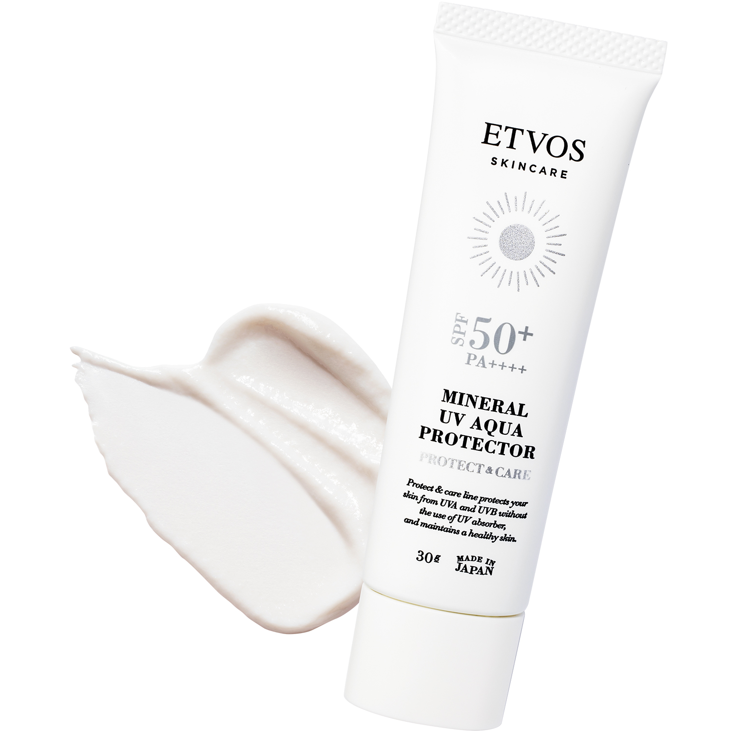 ナイアシンアミドやヒト型セラミド、グリチルリチン酸2Kなど美容液成分72%。防御しつつ潤う透明肌に。ミネラル UVアクアプロテクター SPF50+・PA++++ 30g ¥3,960※数量限定(エトヴォス)