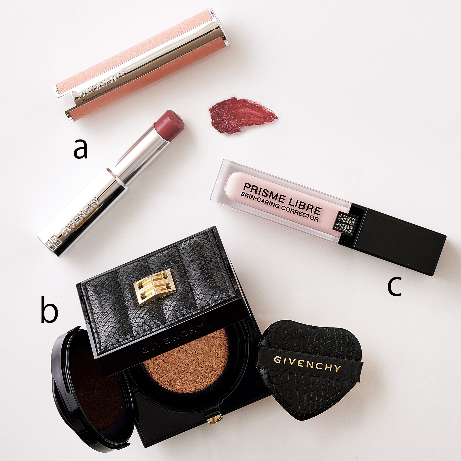 a.ローズ・パーフェクト・シャイン No.114 ¥5,060 b.プリズム・リーブル・スキンケアリング・グロウ・クッション 1-C105 ¥10,120 c.プリズム・リーブル・スキンケアリング・コレクター ピンク ¥5,060(すべてパルファム ジバンシイ)