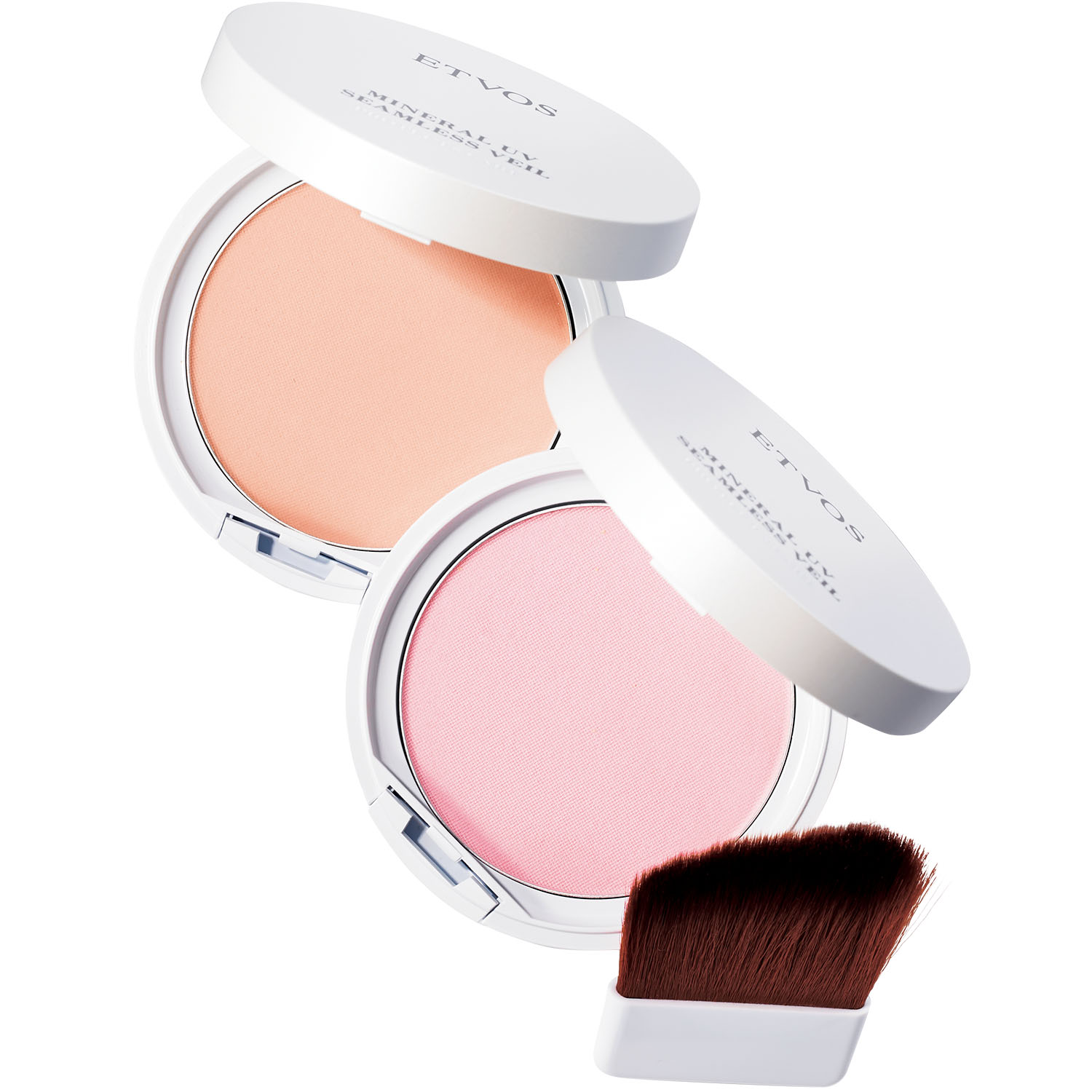 美肌見せ効果もUV防御力も強化。ミネラルUV シームレスベール(上から)ナチュラルベージュ、シアーピンク SPF50・PA++++ 各9g 各¥3,740、エアリーソフト ブラシ ホワイト ¥1,210※一部数量限定(エトヴォス)