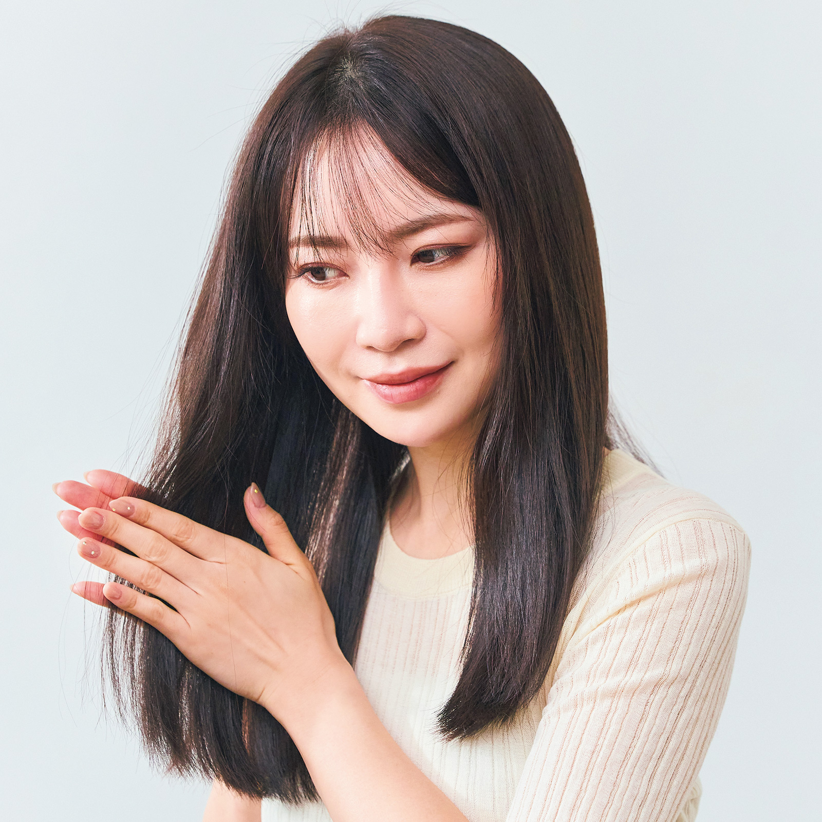 1.ブローする前に、毛流れを整えるヘアミストを全体になじませます。手のひら全体を使って、毛先中心にのばしていきます。