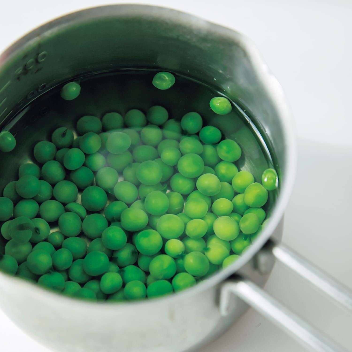 グリンピースは茹でたら湯につけたまま冷ますとシワがよらずふっくらした仕上がりに。