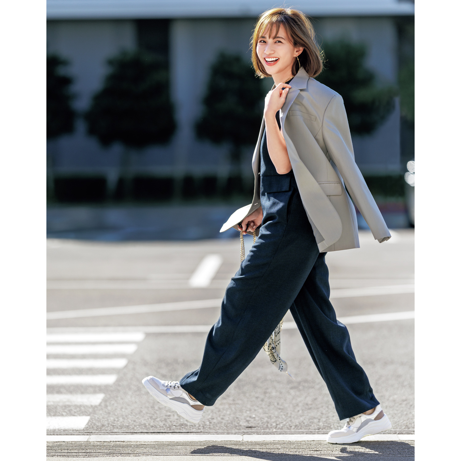 スッキリしたルックスで、品よくスタイルアップ。スニーカー[H4cm]¥26,400(銀座かねまつ/銀座かねまつ6丁目本店)ジャケット¥26,400(FRAY I.D/FRAY I.D ルミネ新宿2店)オールインワン¥14,520(Mila Owen/Mila Owen ルミネ新宿2店)バッグ¥7,700(オリエンタルトラフィック/ダブルエー)ピアス¥47,300(ココシュニック)ネックレス¥4,400(KRONOS/ロードス)バッグに巻いたスカーフ¥22,000 (マニプリ)