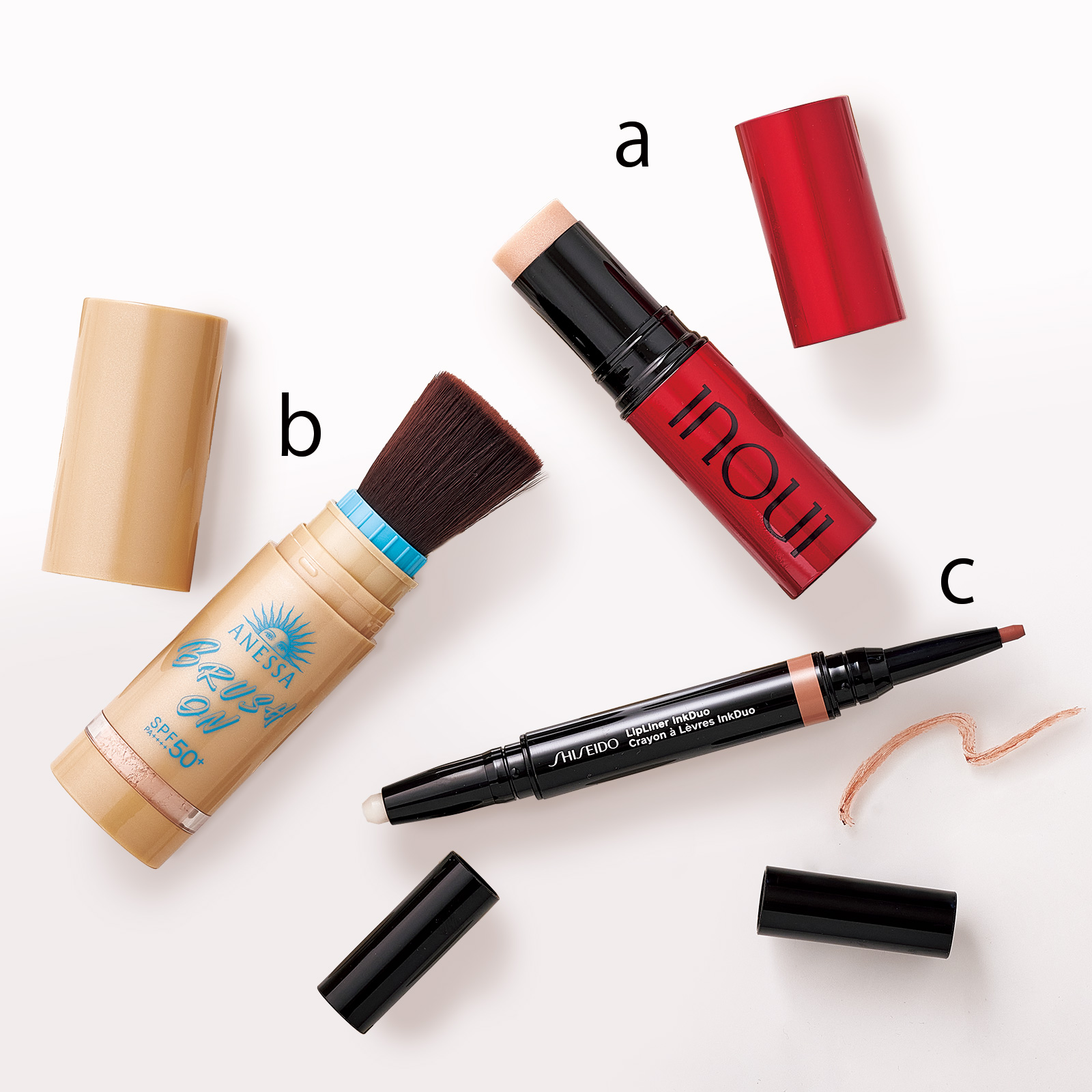 a.インウイ ハイライター 01 ¥5,500(資生堂)b.アネッサ パーフェクトUV ブラッシュオンパウダー SPF50+・PA++++ ¥3,498〈編集部調べ〉(資生堂)c.SHISEIDO リップライナーインクデュオ 02 ¥2,860(SHISEIDO)
