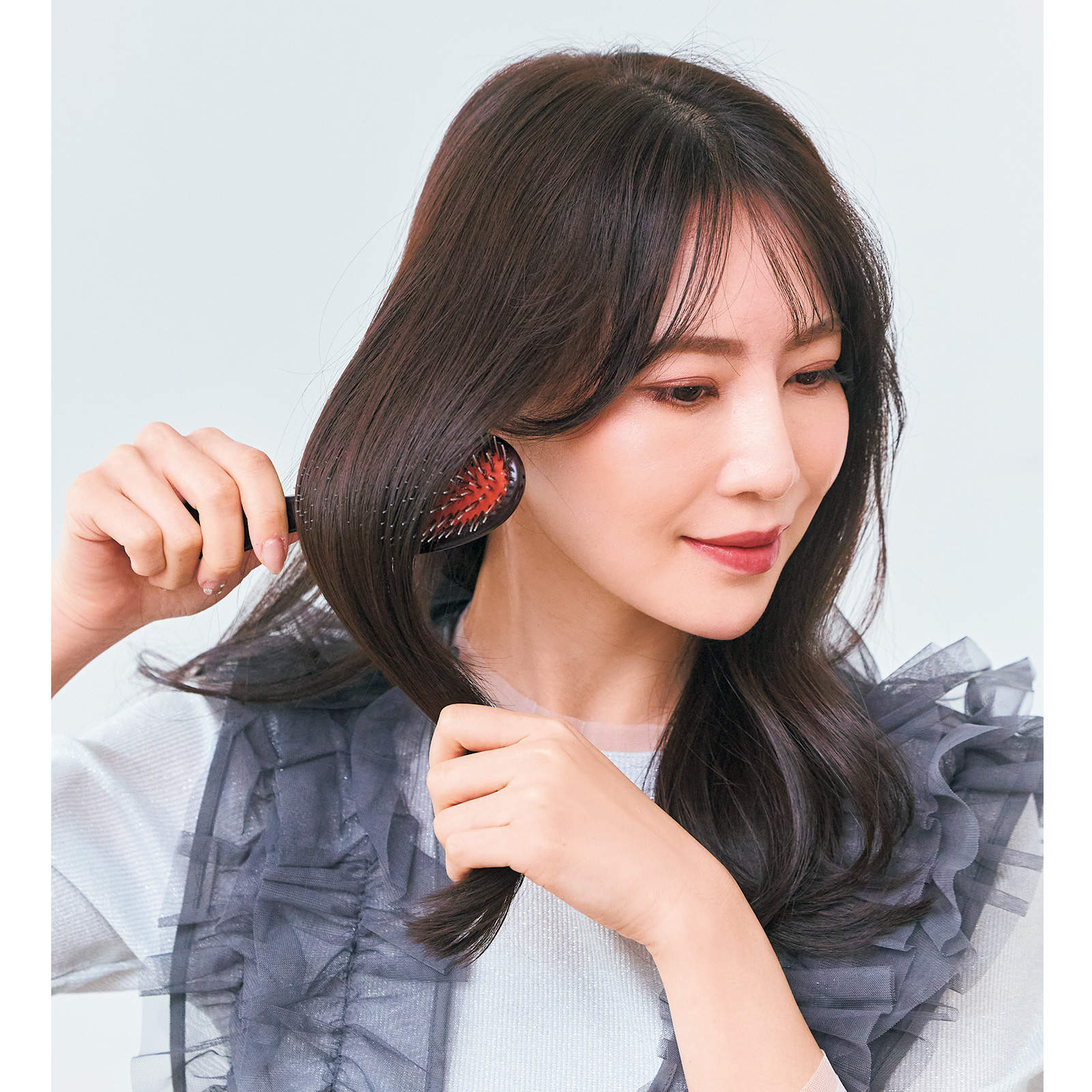 4.ブラシを内側から通して、上段と下段の巻きが一体化するように、大きな流れのあるカールに整えます。