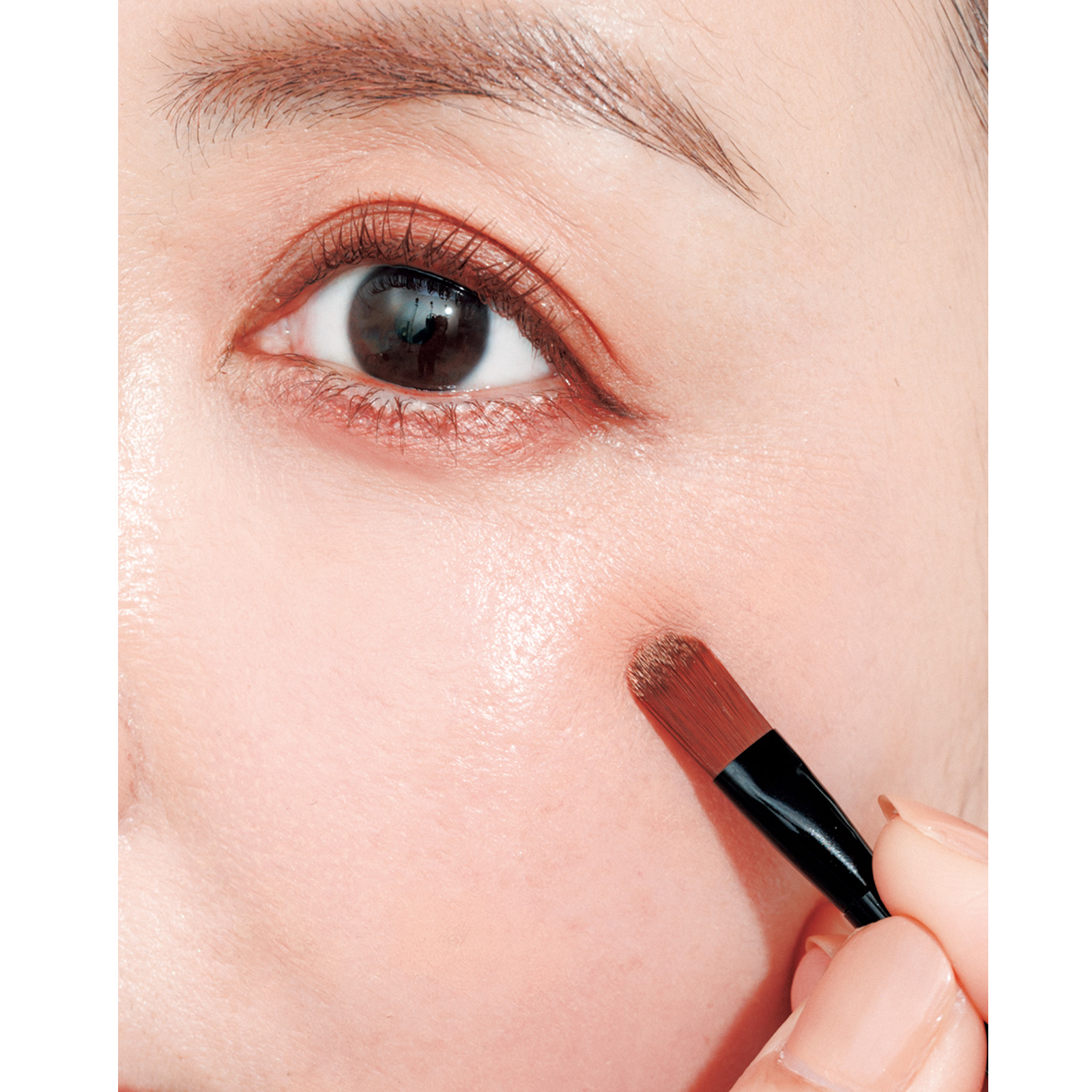 パーツメイクを終えたらコンシーラーをチップの先端にとり、シミに軽く塗布。チップは肌と垂直になるように持ち、スタンプを押すようにこすらずのせていくのがコツ。濃いシミもみるみる隠れていきます。
