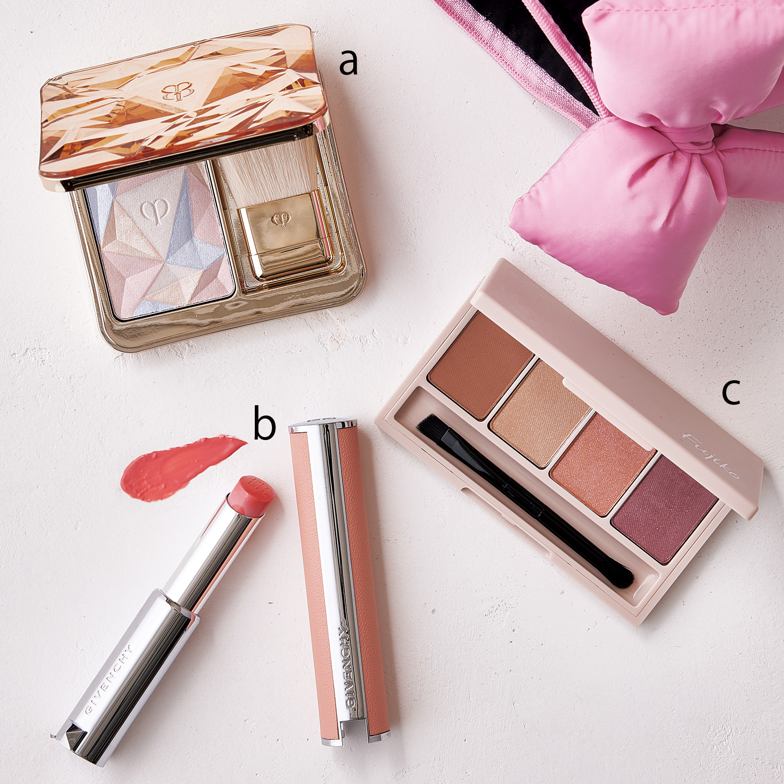 a.肌全体をトーンアップ。ル・レオスールデクラ 21 ¥9,350 (クレ・ド・ポー ボーテ)b.お気に入りの若見えピンク。ローズ・パーフェクト 108 ¥4,620(パルファム ジバンシイ)c.まぶたや眉に。トーンを揃えて今っぽく。足しパレ 05 ¥2,178(かならぼ)