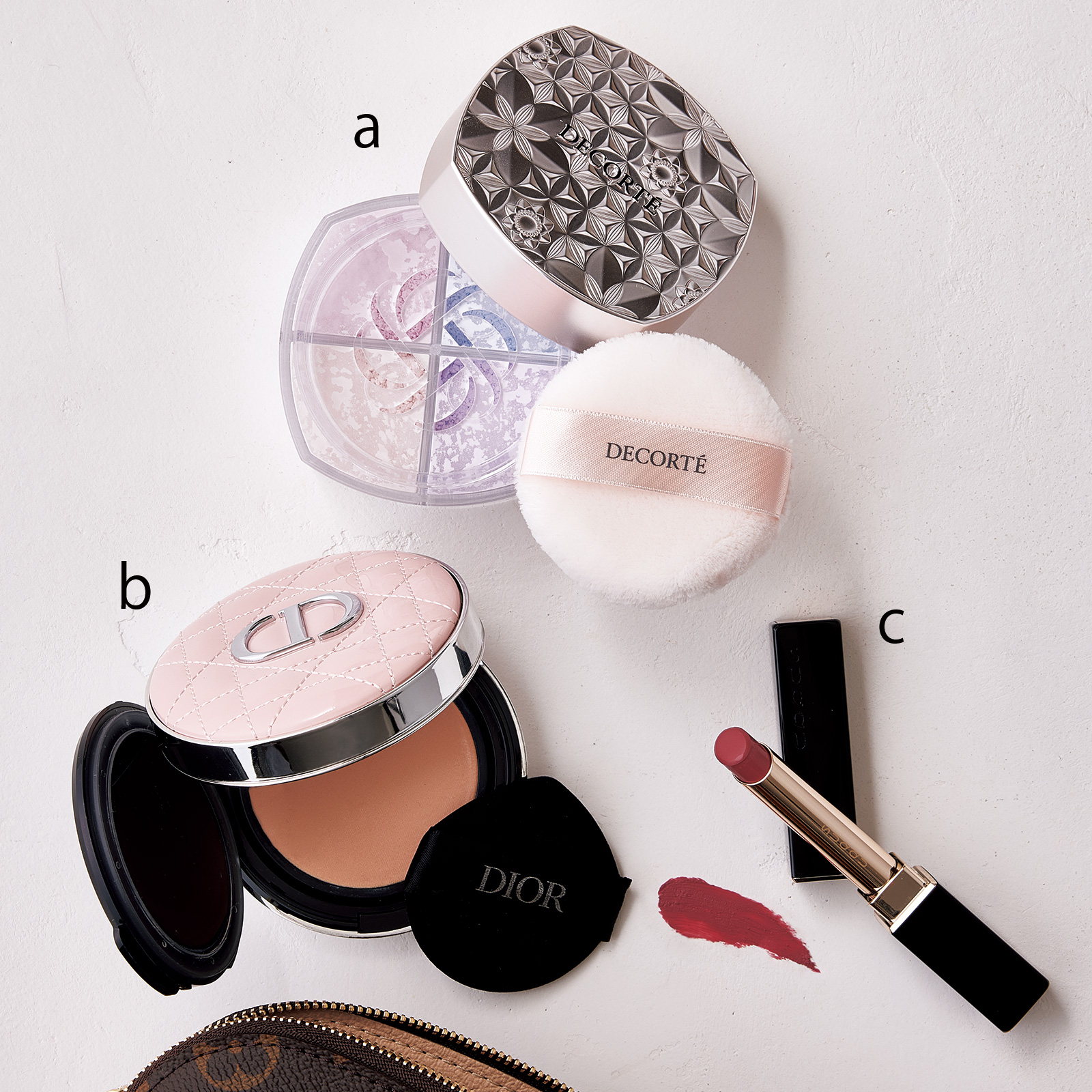 a.ルース パウダー 101 ¥6,050(コスメデコルテ)b.ディオールスキン フォーエヴァー イドラ グロウ クッション リフィル 1N ¥6,710 ディオールスキン フォーエヴァー クッション ケース ピンク カナージュ ※限定 ¥4,180 (ともにパルファン・クリスチャン・ディオール)c.ベルベット フィット リップスティック 06 ¥5,830(セット価格)(SUQQU)
