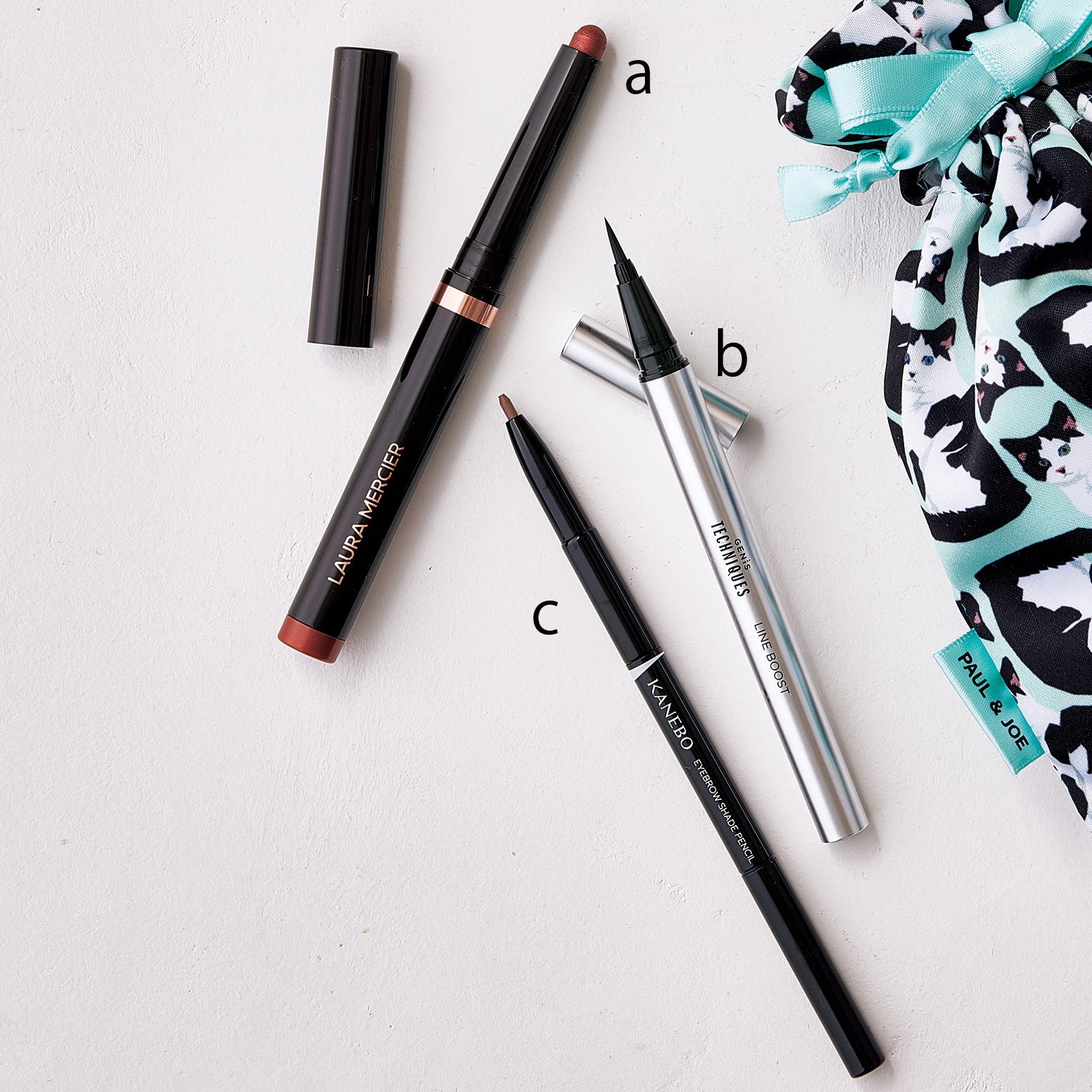 a.二重幅に入れて主張する眼差しに。キャビア スティック アイカラー N R04 ¥3,850 (ローラ メルシエ)b.ひと塗りでグッと目力UP! LINE BOOST マットブラック ¥1,980 (GENiS)c.色味がほど良く抜け感を演出できる。カネボウ アイブロウシェイドペンシル EP2 ¥4,400 (カネボウインターナショナルDiv.)