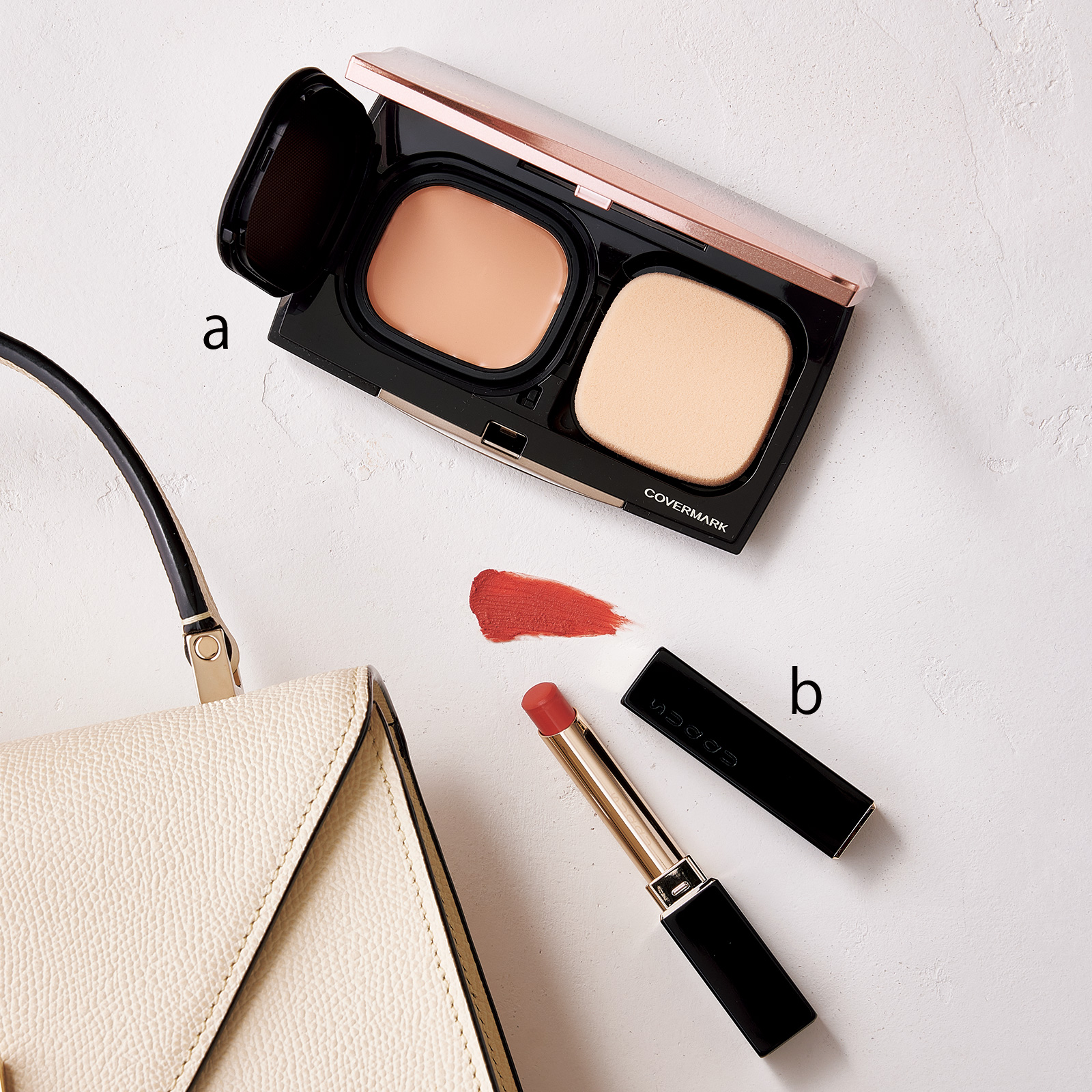 a.とにかくシミが隠せるのできちんとしたい日に最適! フローレス フィット FR10 ¥7,700 (カバーマーク)b.顔がパッと明るくなる春らしい色がいい! マットできちんと感あり、細軸なので塗り直し仕草も優雅。ベルベット フィット リップスティック 04 ¥5,830(セット価格)(SUQQU)