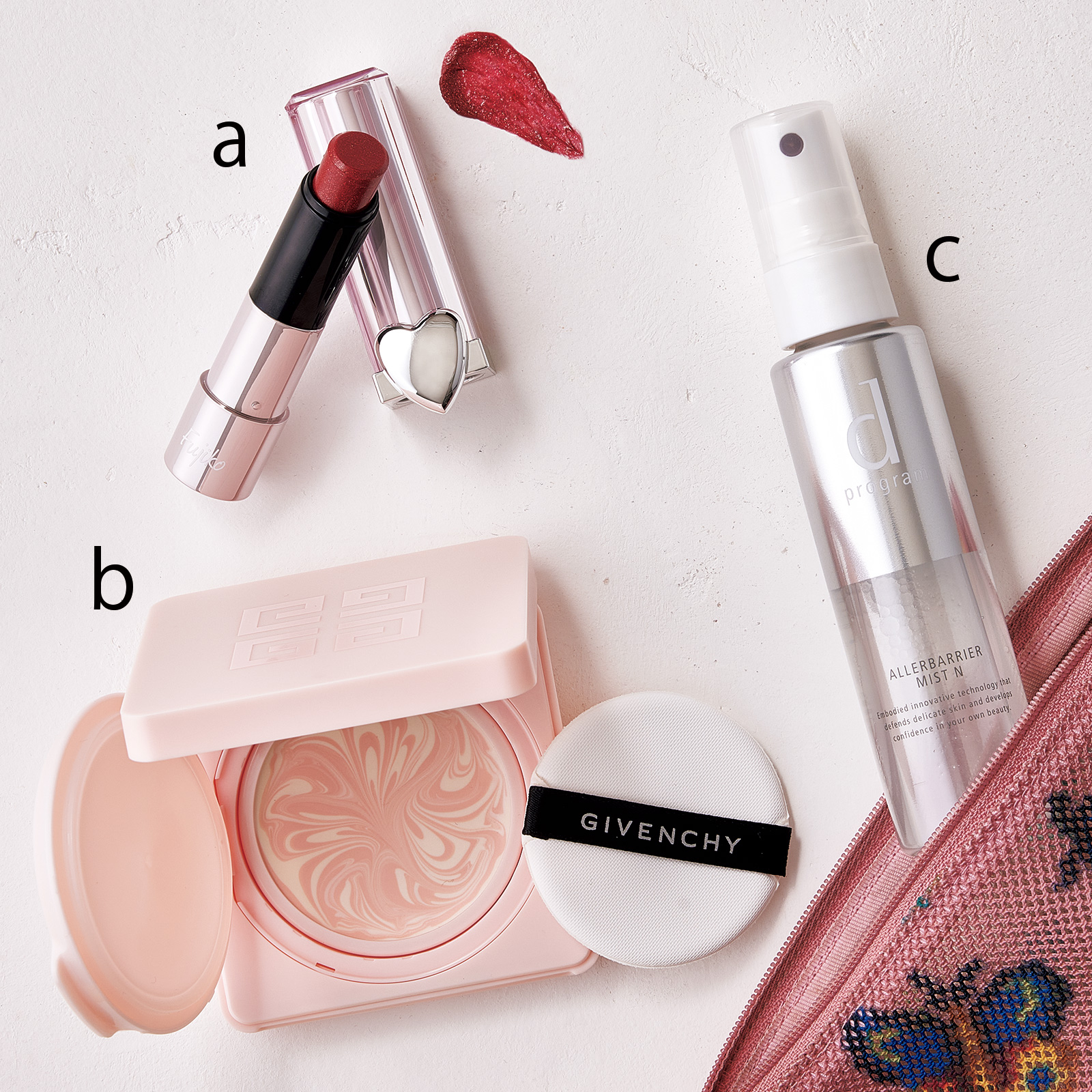 a.青や赤の大粒ラメで瞬時に旬顔に。フジコ ノールックリップ 101 ¥1,540 (かならぼ)b.保湿とUVケアのハイブリッド。スキン PFCT コンパクト クリーム N ¥9,680 (パルファム ジバンシイ)c.花粉やほこりのガードに。d プログラム アレルバリア ミスト N 57ml ¥1,650 (資生堂)