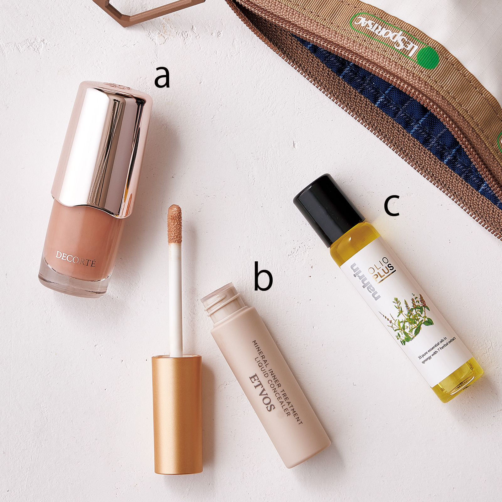 a.自然なベージュで手全体がキレイ見え。スキニフィック ネイルラッカー 01 ¥3,300(コスメデコルテ) b.ポイントでシミやクマを消すのに最適。ミネラルインナートリートメントリキッドコンシーラー ピンクベージュ ¥3,850(エトヴォス) c.ハーブオイル33+7 ロールオン 10ml ¥3,080 (ナリン)