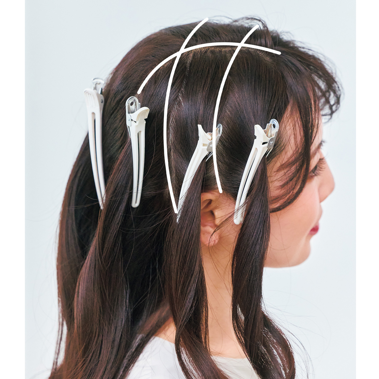 ミックス巻きは全体の髪を縦スライスで分けるのが決め手。髪が多い人は8つ、少ない人は6つくらいが目安です。