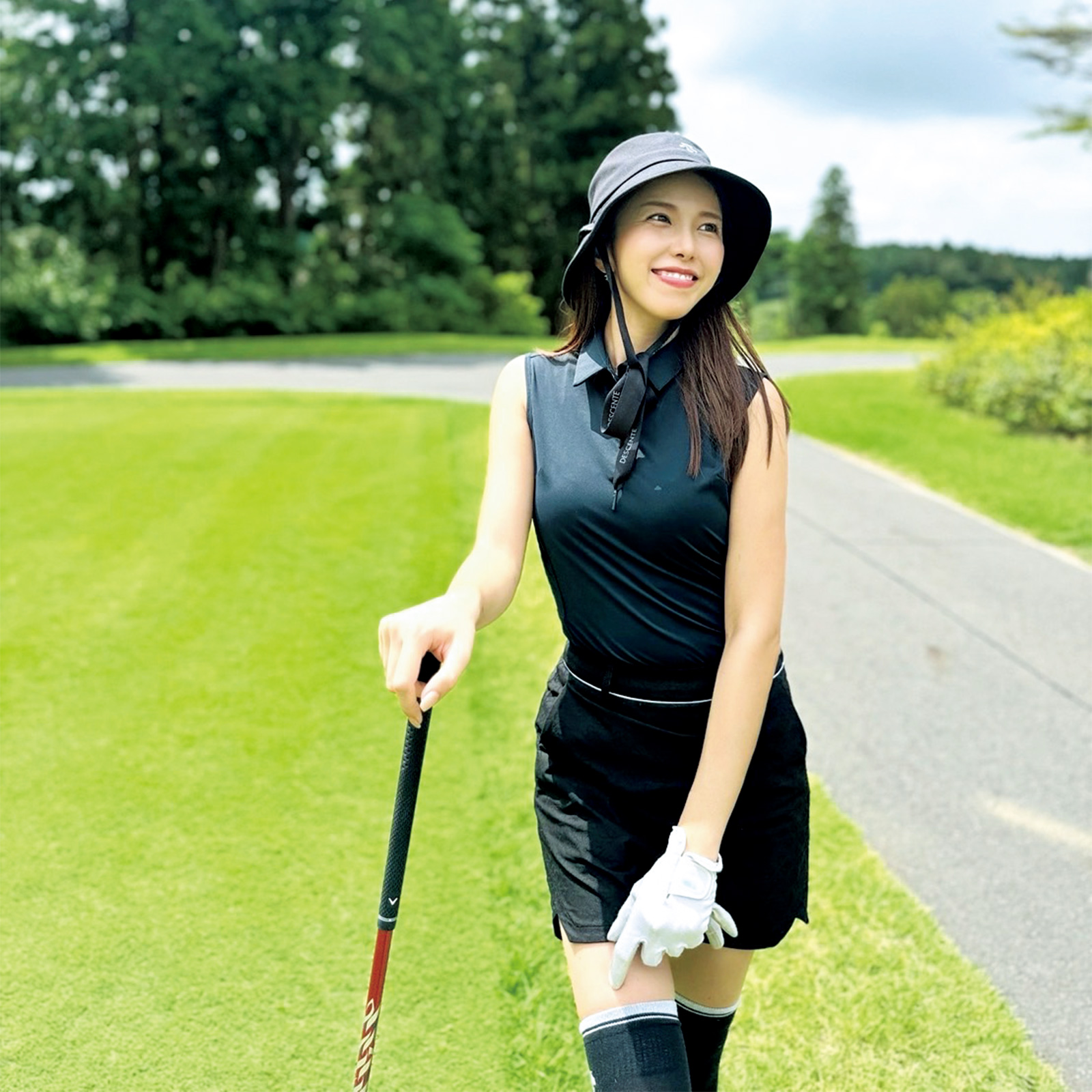 月に3〜4回はラウンド。自然の中で日差しを浴びる心地よさを楽しみながら、シミ対策をするのがモットー。日傘と帽子をフル活用。
