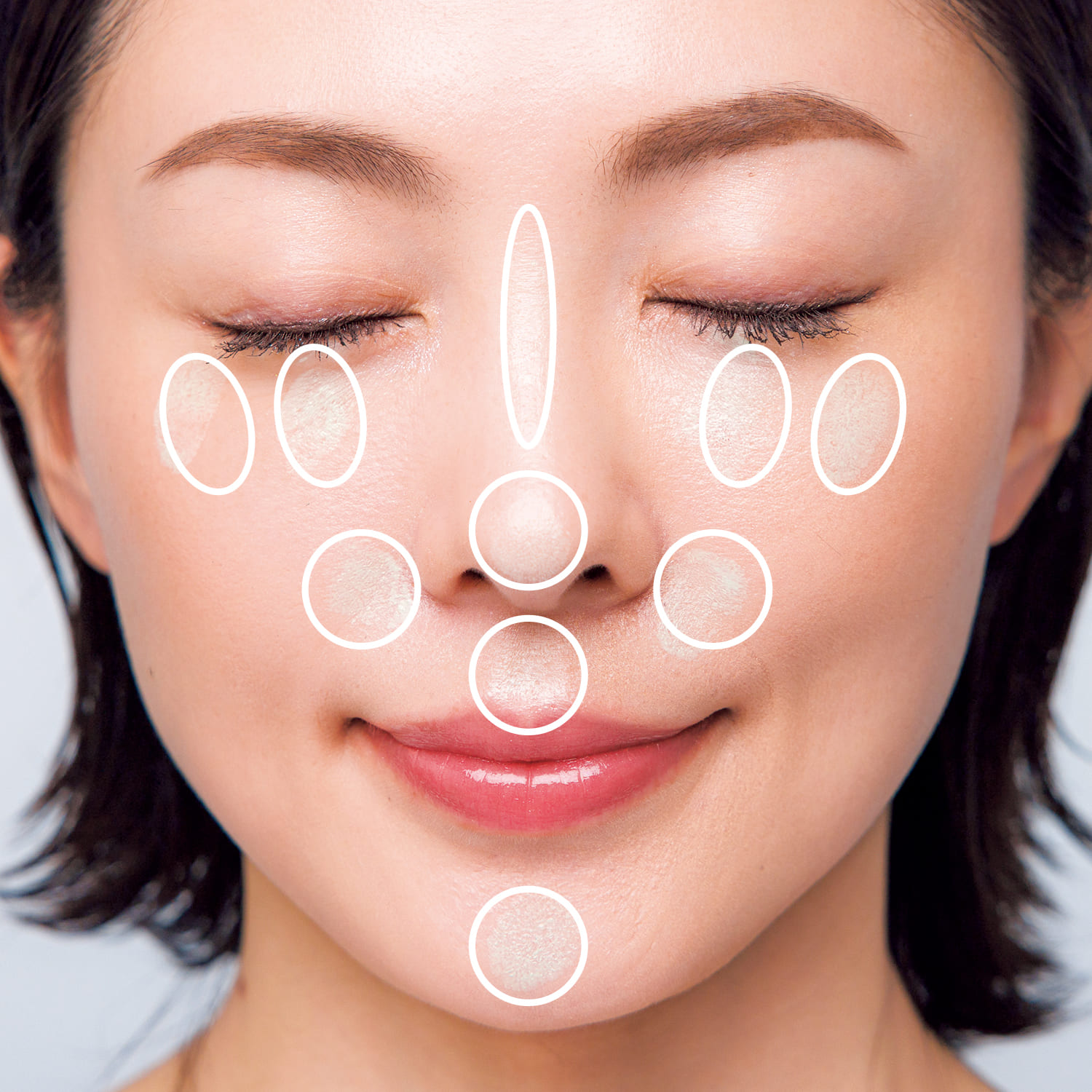 肌がくすんできたら、鼻筋、目の下、口角、小鼻の脇、顎先に置いて馴染ませ、くすみを飛ばす。
