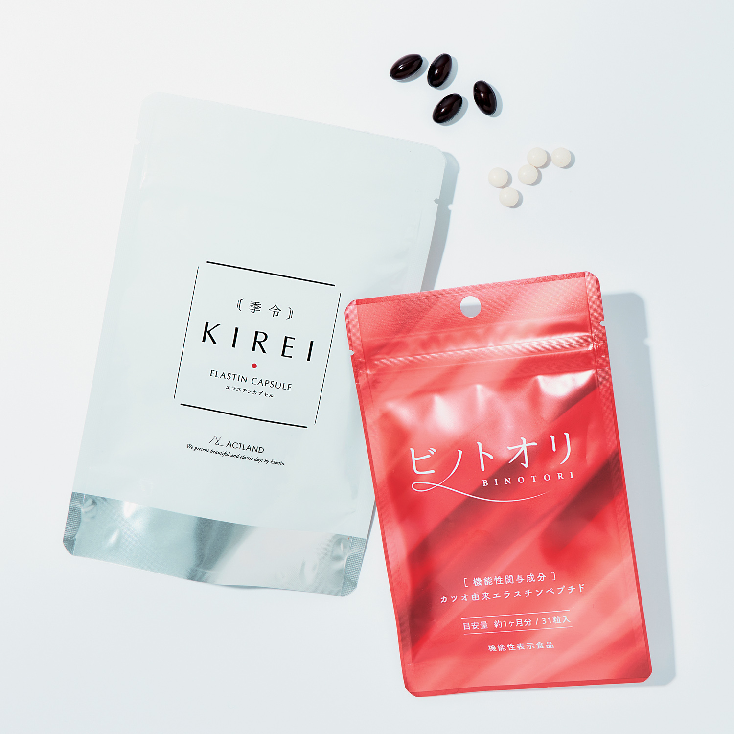 (左)1回分3粒に業界最高水準120mgのエラスチンを配合。季令エラスチンカプセル 100粒 ¥17,280(ACTLAND)(右)1日1粒で肌の末梢血流と弾力を維持し、肌の潤いを守ります。ビノトオリ31粒 ¥5,800(オルト)