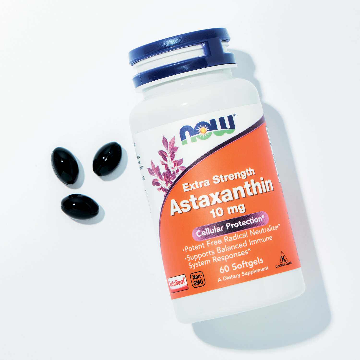 紫外線や乾燥から肌を守りシミを防いで美白をサポート。肌の潤いも守ってくれます。NOW Foodsアスタキサンチン 10mg ソフトジェル60粒 ¥3,479〈編集部調べ〉(iHerb)