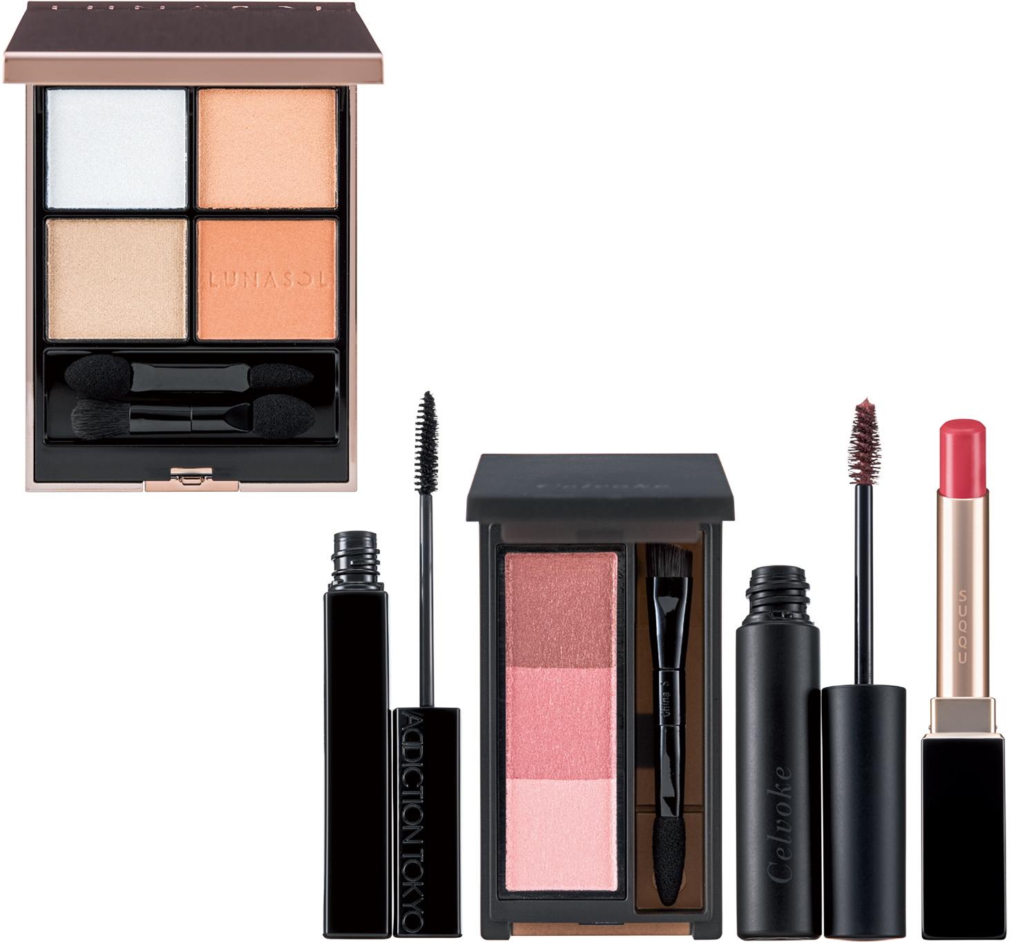 上段左から:溢れ出る透明感で、澄んだ奥行きのある目元を演出。ルナソル アイカラーレーションN 04 12℃ signs of spring ¥7,700(カネボウ化粧品)艶やかな漆黒が繊細なまつ毛を際立たせ目力アップ。アディクション ザ マスカラ カラーニュアンス WP 017 Ultra Black ¥4,180(ADDICTION BEAUTY)ピンクみのある絶妙カラーで立体感を出しつつ、ふんわりとした抜け感のある洗練眉が完成。セルヴォーク インディケイト アイブロウパウダー 11 ¥3,850、セルヴォーク インディケイト アイブロウマスカラC 08 ¥3,080 ※4/11発売(ともにCelvoke)唇の輪郭よりややオーバー気味に塗って、フレッシュな大人の可愛らしさも叶える。SUQQU ベルベット フィット リップスティック 04 夕桃 -YUUMOMO ¥5,830 ※セット価格(SUQQU)
