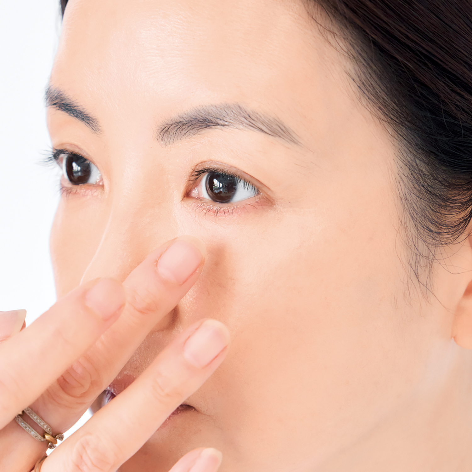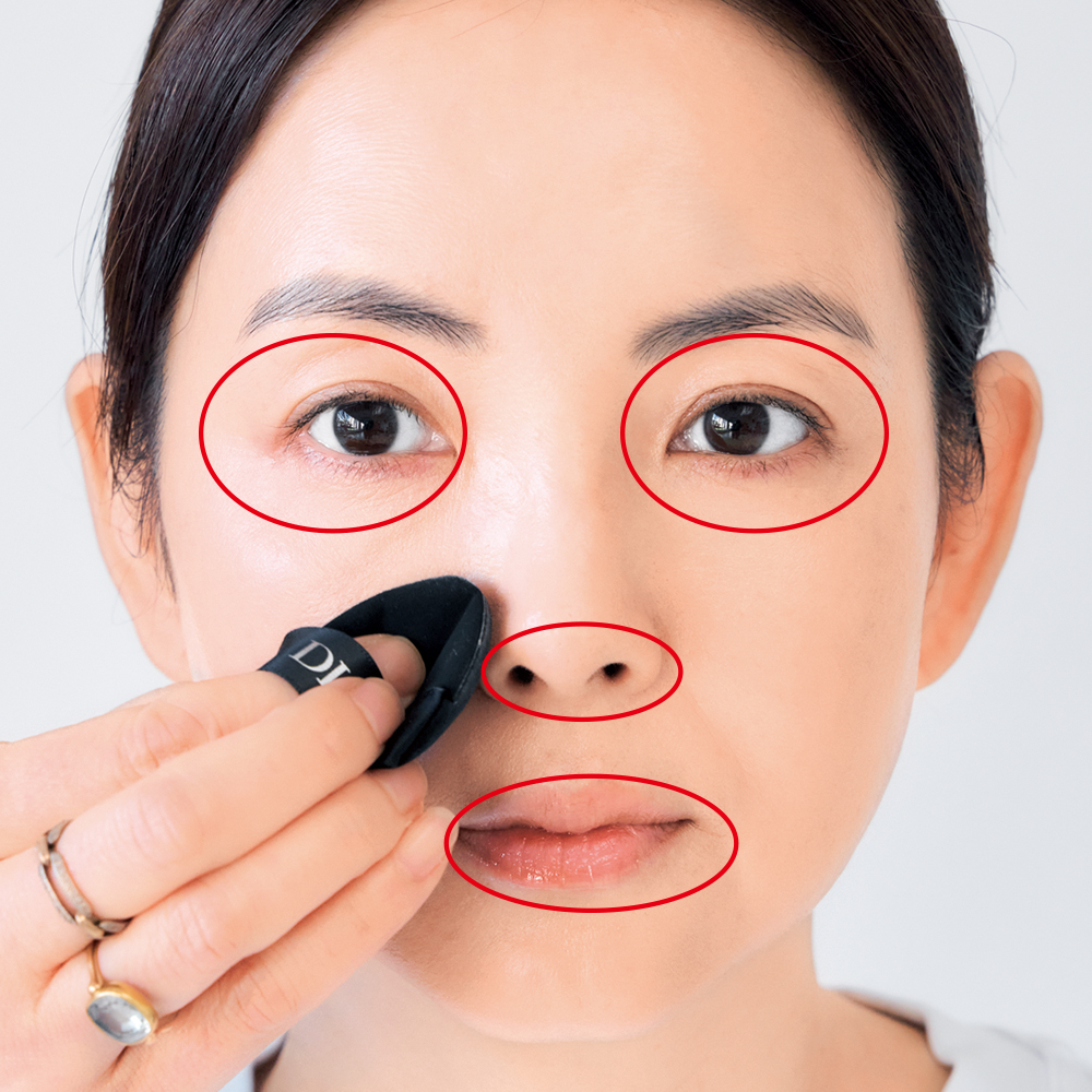指で広げすぎないようぼかし、つけすぎた時は一旦手の甲に戻してから気になるところに。口周りやほうれい線、鼻筋なども指で重ねます。コンシーラーはファンデの質感を消さずにカバーすることが大切!