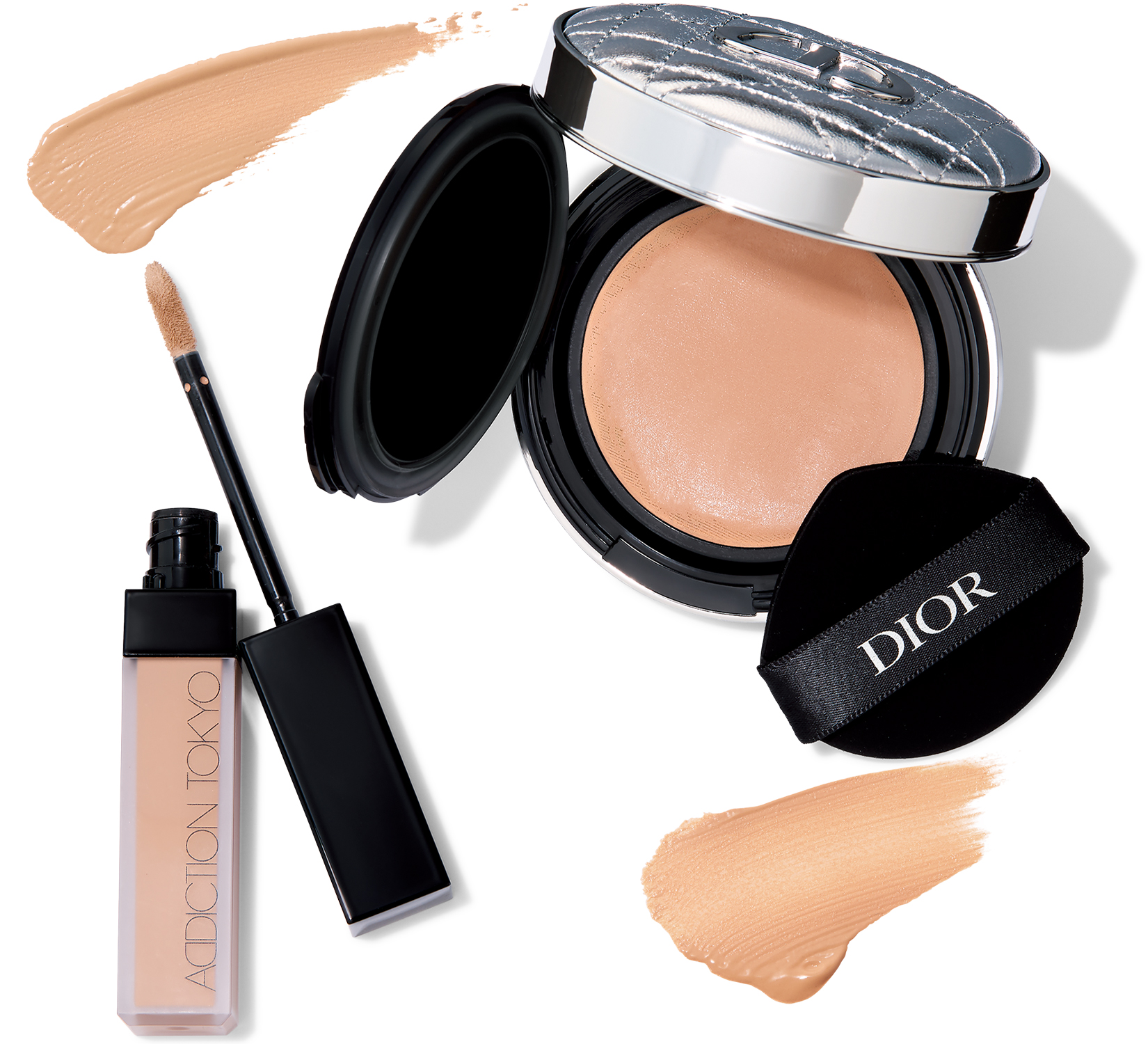 左:薄膜で色ムラなどをピンポイントに補整し、素肌のなかに消えてしまったかのような完璧な仕上がりを長時間キープ。肌トーンや肌悩みに合わせて選べる全15色。ADDICTION アディクション スキンリフレクト フィックス コンシーラー 010 Neutral Beige ¥3,850(ADDICTION BEAUTY)右:薄づきで瞬時に色ムラを補整し、フローレスな艶肌を演出する新感覚クッションファンデ。DIOR ディオールスキン フォーエヴァー イドラ グロウ クッション 2N SPF50・PA+++ リフィル ¥6,710、ディオールスキン フォーエヴァー クッション ケース シルバー カナージュ ¥3,630(ともにパルファン・クリスチャン・ディオール)