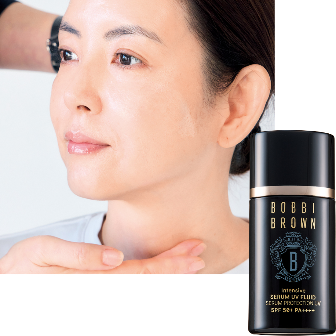 キメを整えながらなめらかなツヤ肌に仕上げるスキンケアUVベースを使用。手の甲に適量取り頰の高い位置から顔全体に塗り広げていきます。さらに首まで伸ばしてしっかり紫外線対策。内側から輝くような透明感をサポートするスキンケア成分配合UV。インテンシブ セラム UV フルイド SPF50+・PA++++ 30ml ¥7,150(ボビイ ブラウン)