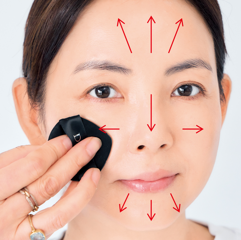 下地は頰からのせて、首元までカバー。クッションファンデは少量をサーッとパフを滑らせるように肌に馴染ませます