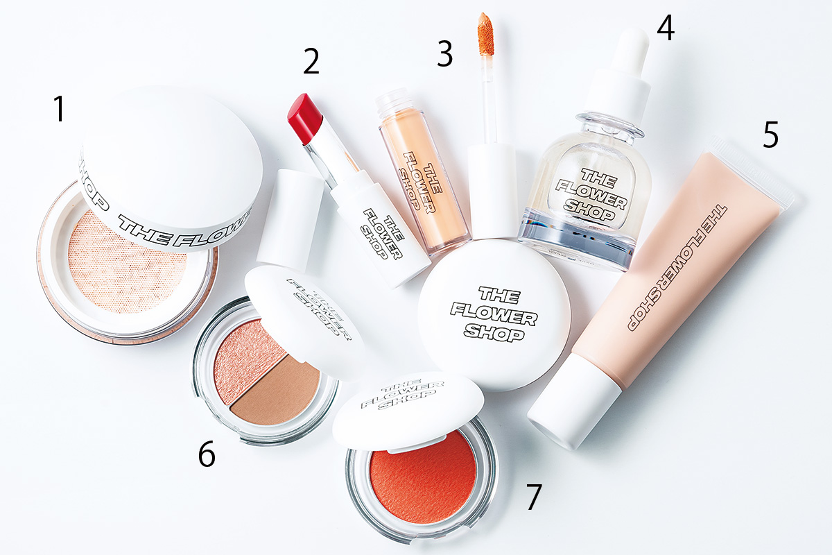 1・美容成分を含んだ軽いつけ心地のパウダーは毛穴レスな肌を実現。 ルースパウダー7g¥2,750 2・ムチッとした唇に仕上げてくれる、プランパー成分と保湿成分を配合した口紅。ペタルルージュ 〈全4色〉ピュアスイートピー¥2,420 3・素肌になりきってくれるコンシーラー。コンシーラー 〈全3色〉オレンジ SPF40・PA++++ 3g¥2,750 4・顔はもちろん、体にも髪にも使えるマルチオイル。ベタつかず、シルクのような手触り。シルキー ドロップ オイル 30ml ¥3,080 5・白浮きしないのに高いカバー力が嬉しい下地。ザ・フラワーショップ ベース 〈全2色〉ピンクSPF37・PA+++ ¥3,080 6・シアーなラメとマットなテクスチャーの2種類のアイシャドウがセットに。一つで印象的な目元に仕上げます。アレンジメントシャドウ〈全3色〉ミスティックアンバー¥2,420 7・余白が気になる中顔面に自然な立体感が。グロウチーク〈全3色〉オレンジポピー¥2,420(すべてmsh)