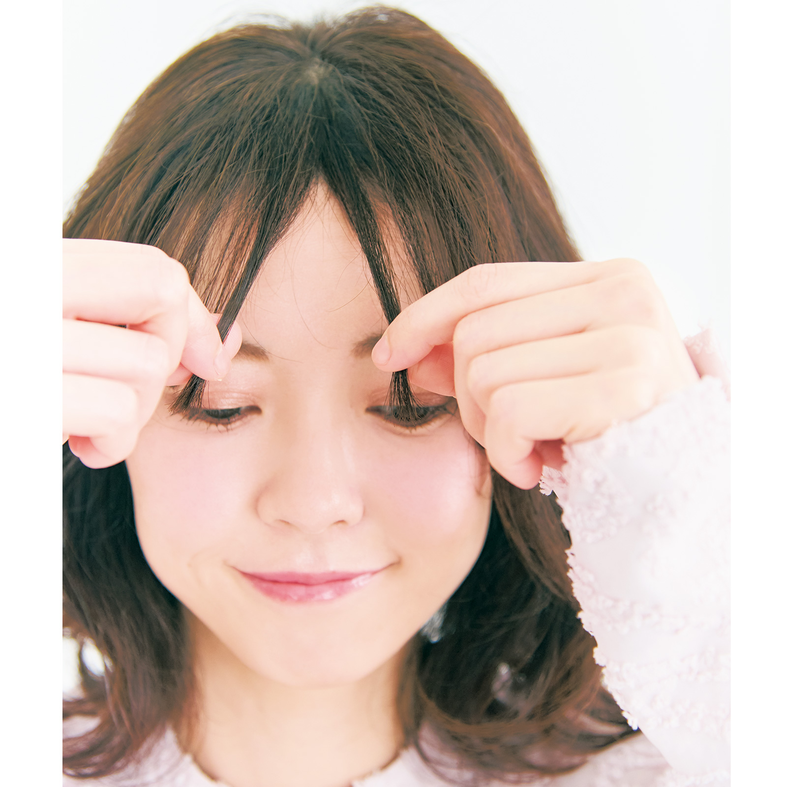 3.指先にオイルをなじませ、カールした前髪をつまみ、束感を作ります。つけすぎるとカールが取れるので、少量をつまむようにつけること。