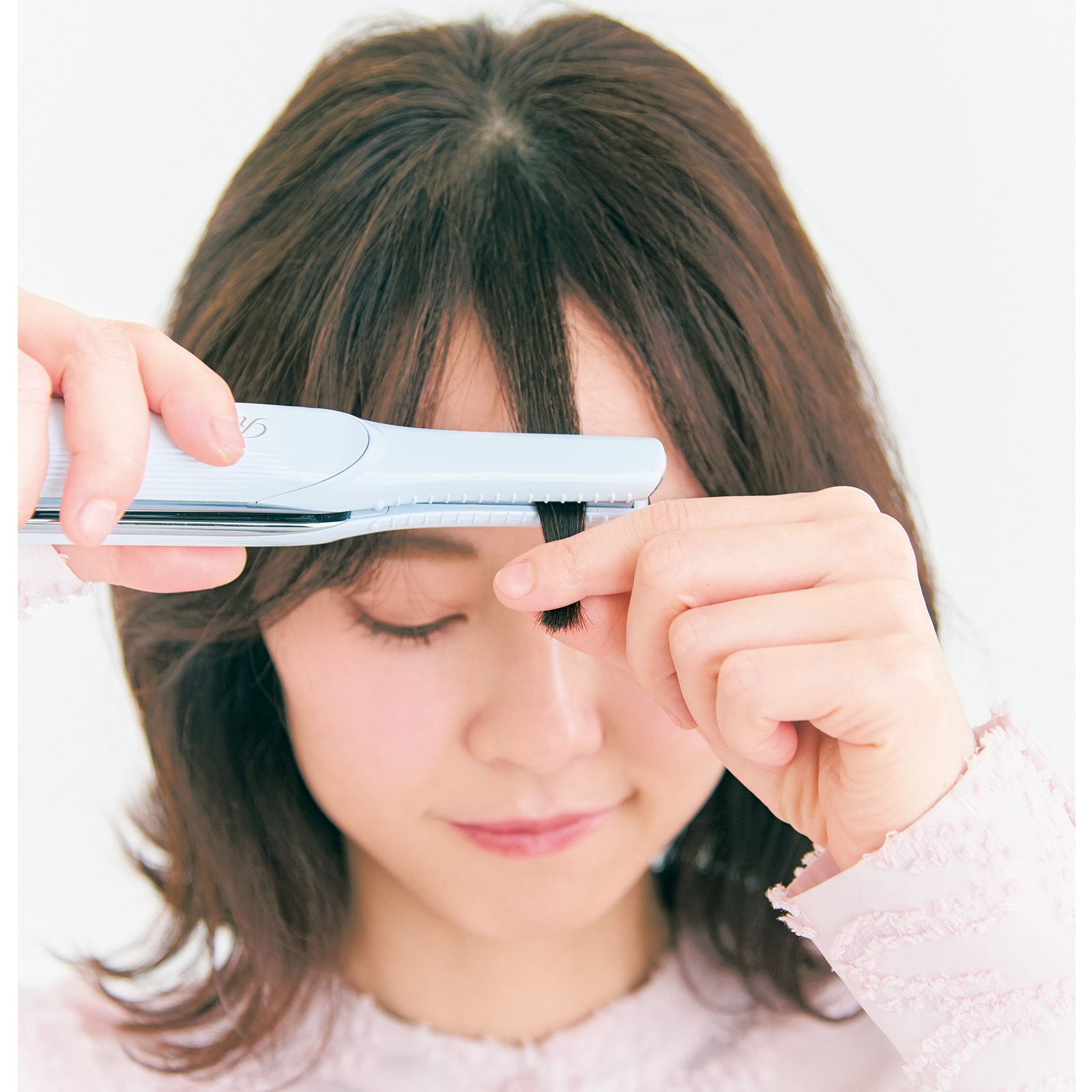 1.前髪の中心は、毛先が下に向かうCカールに。フィンガーアイロンで根元を挟んだら、そのまま毛先までスライドさせて巻きます。