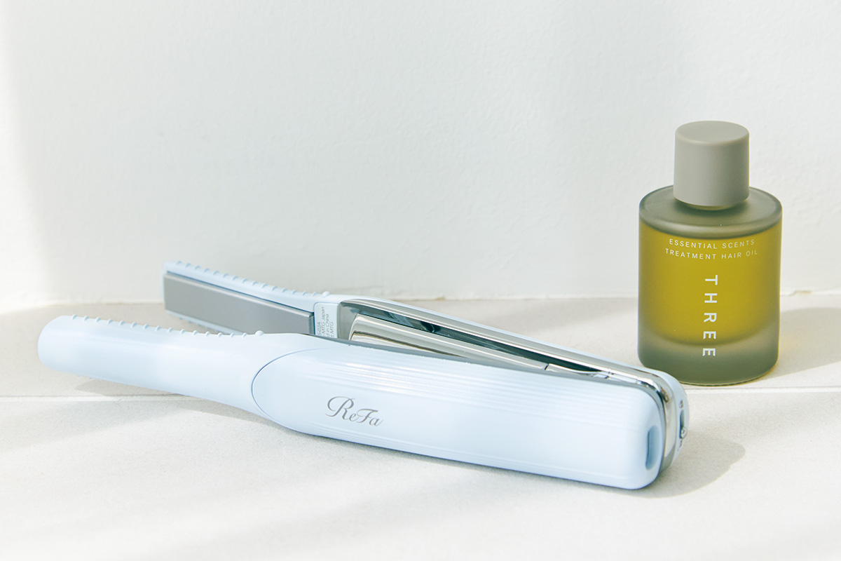 適度な束感が作れるオイル。THREE エッセンシャルセンツ トリートメント ヘア オイル 30ml¥3,960(THREE)短い前髪も簡単にセットできる、小回りが利くアイロン。リファフィンガーアイロン ST ホワイト¥14,500(MTG)