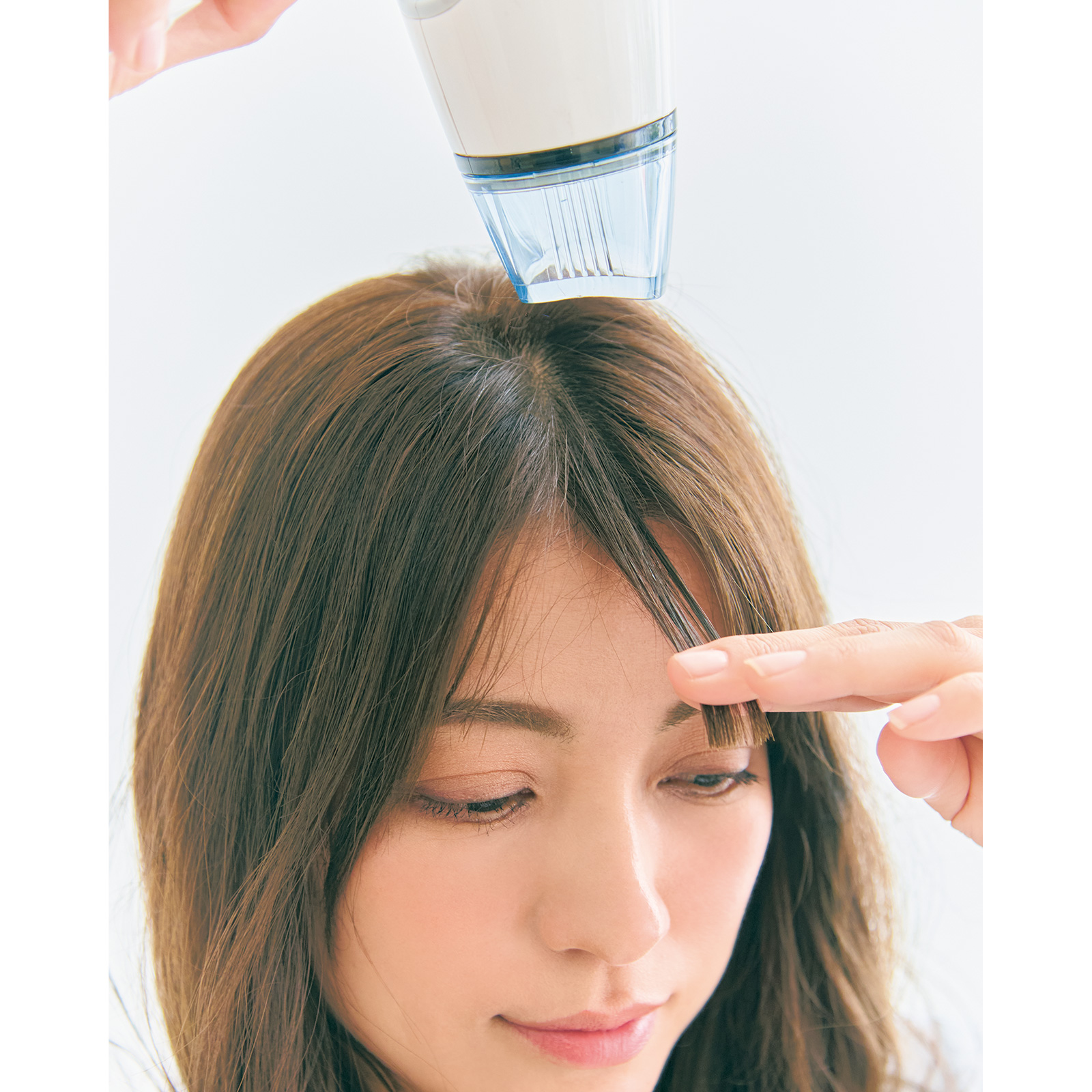 1.前髪の根元が立ち上がっていると生え際の薄さが目立つので、根元が潰れるように引き出しながらハンドブローします。